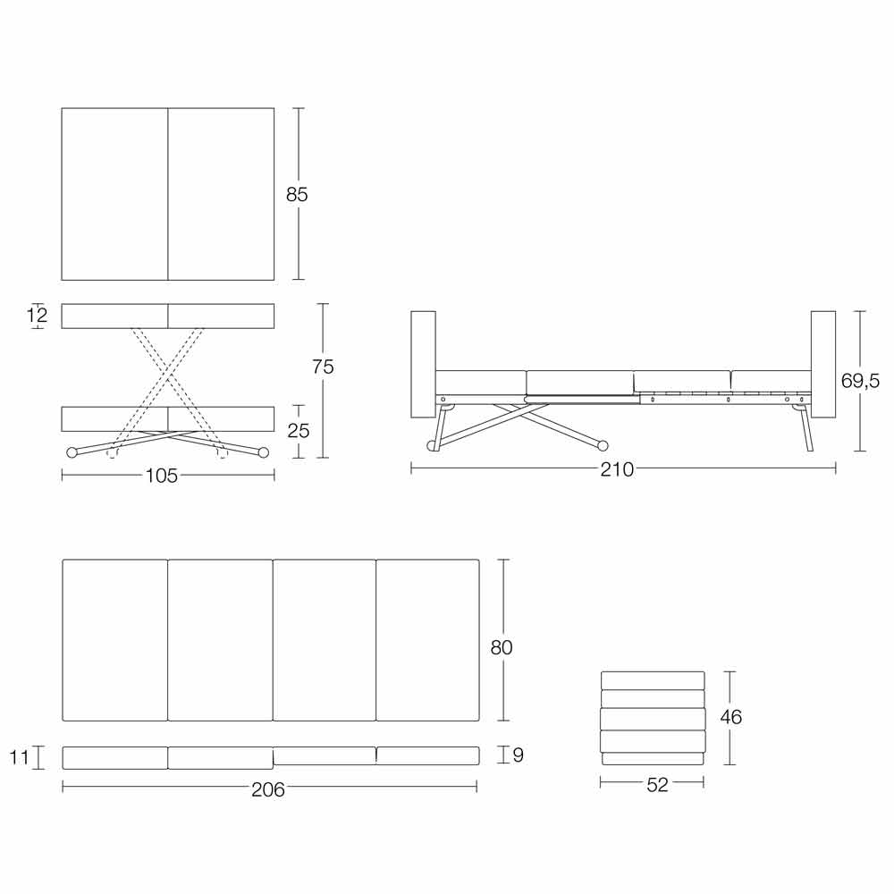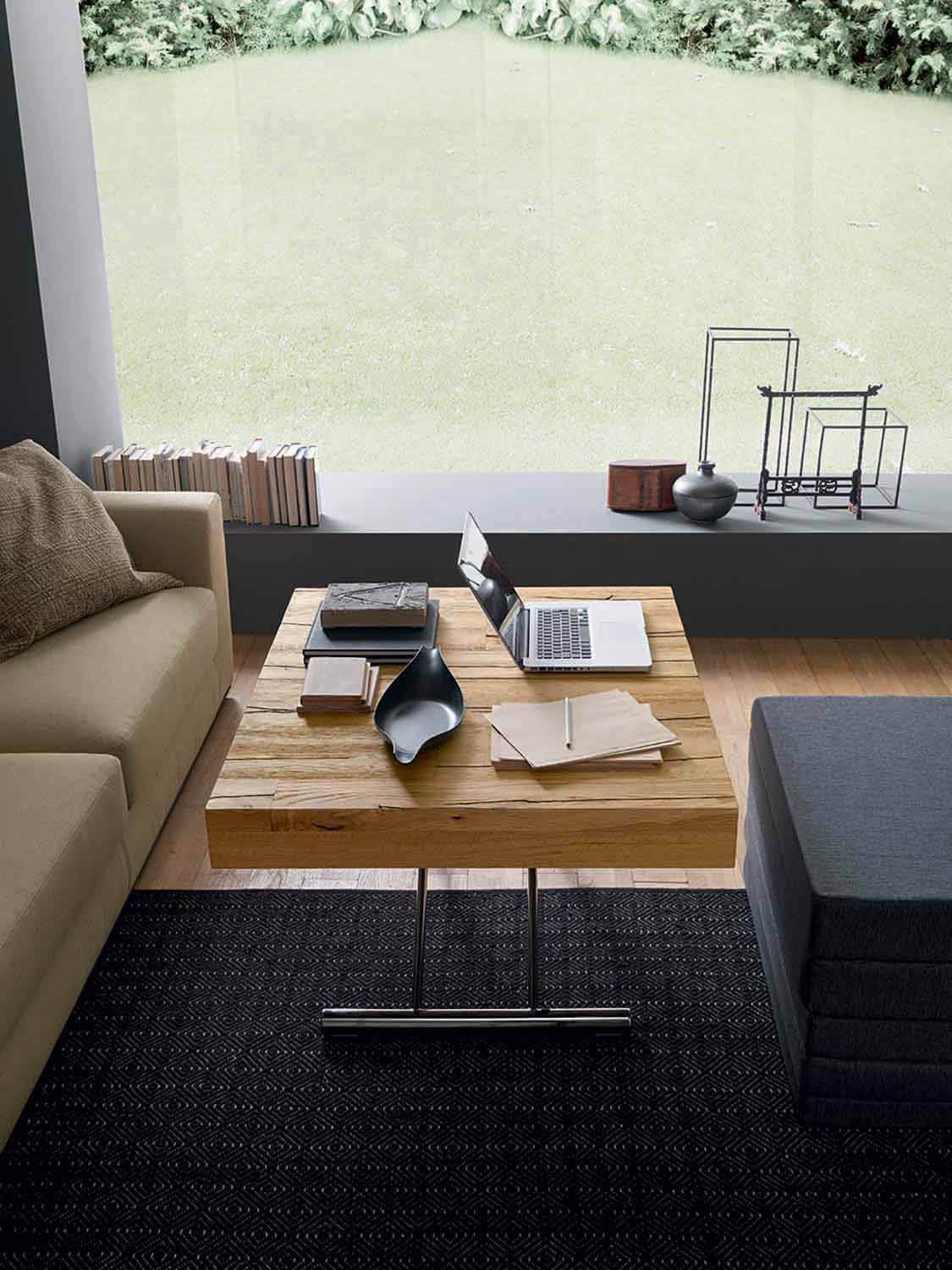 mesa de centro transformável caracteriza-se por linhas elegantes e versáteis capazes de se mover em altura para cumprir a função de mesa de jantar que, se necessário, evolui dando forma a uma cama confortável de design requintado.