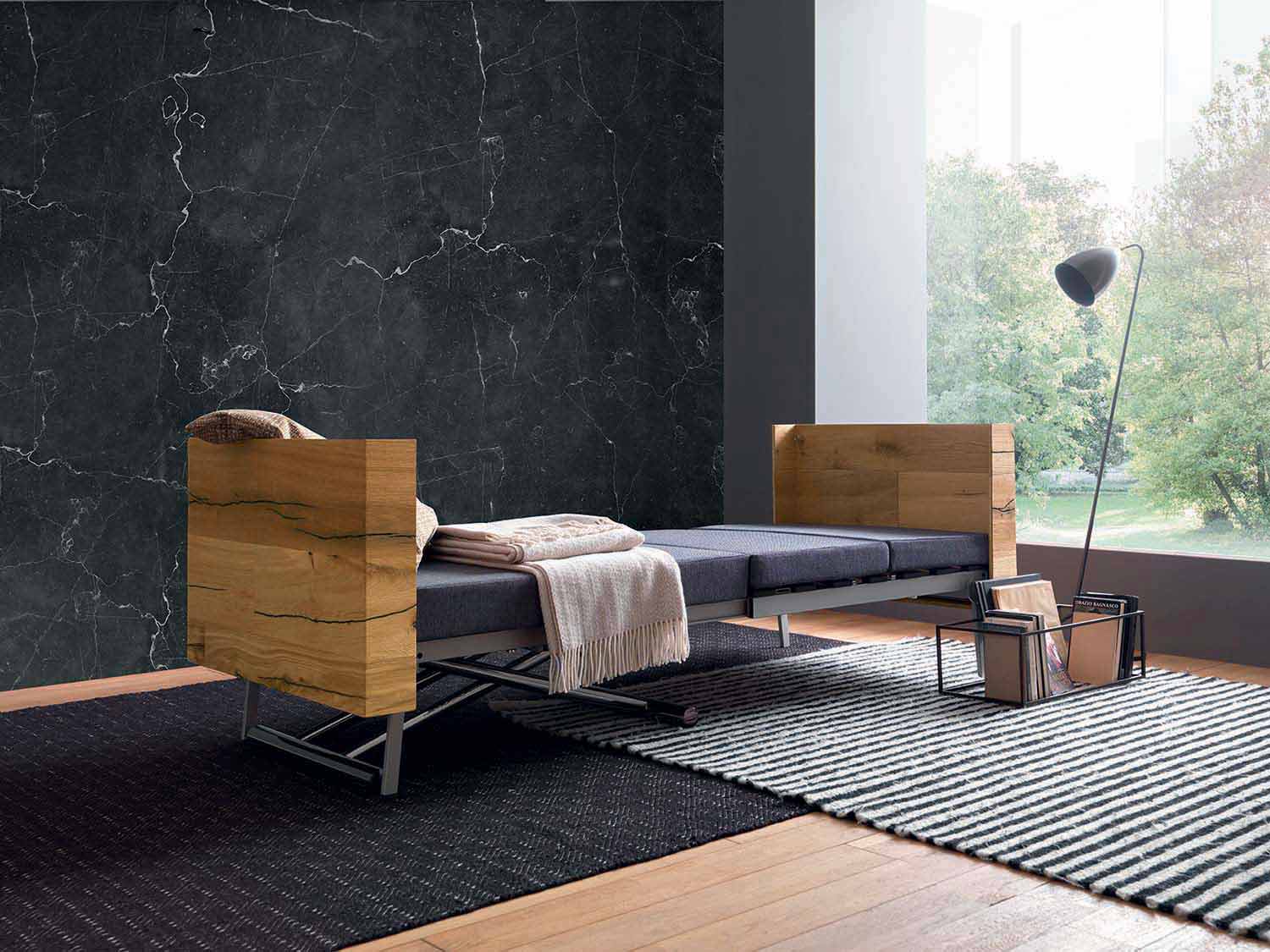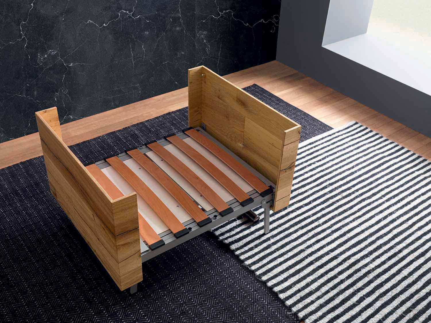 Equipado com pufe convertível em colchão (espuma de poliuretano ignífugo D 35), revestido a tecido cinzento. Base ripada e painel em compensado. Pernas de apoio dobráveis. Tavoletto
