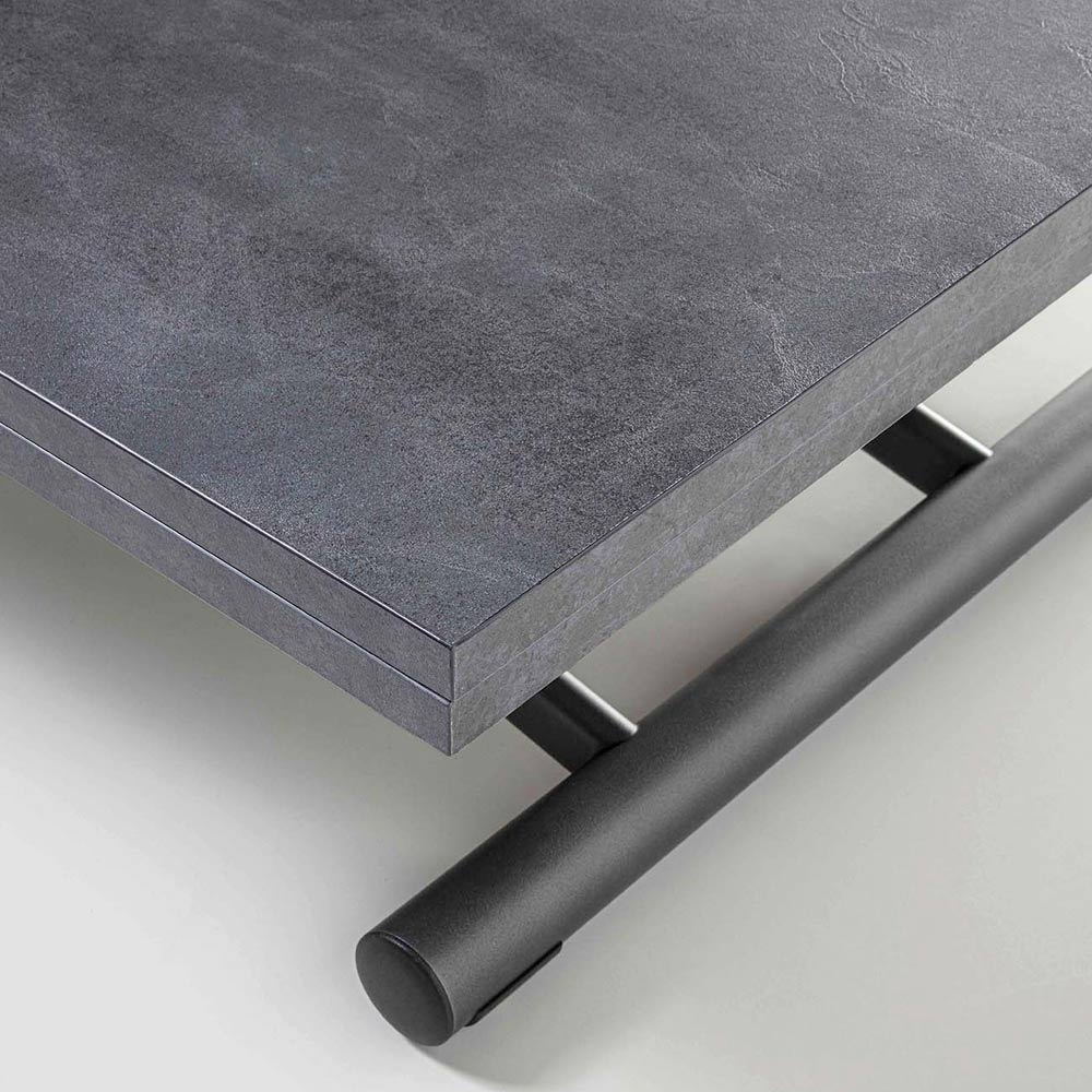 metálica com acabamento antracite. A particularidade desta mesa de centro única e inovadora é a sua estrutura que permite que se transforme de forma rápida e fácil numa prática mesa de jantar. Esta funcionalidade maximiza a sua