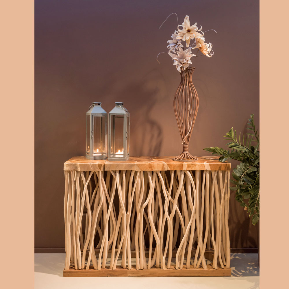 O trabalho artesanal e o uso da madeira em sua forma mais autêntica fazem de cada mesa de console uma peça única, na qual os veios e as irregularidades naturais se tornam elementos de grande valor estético.