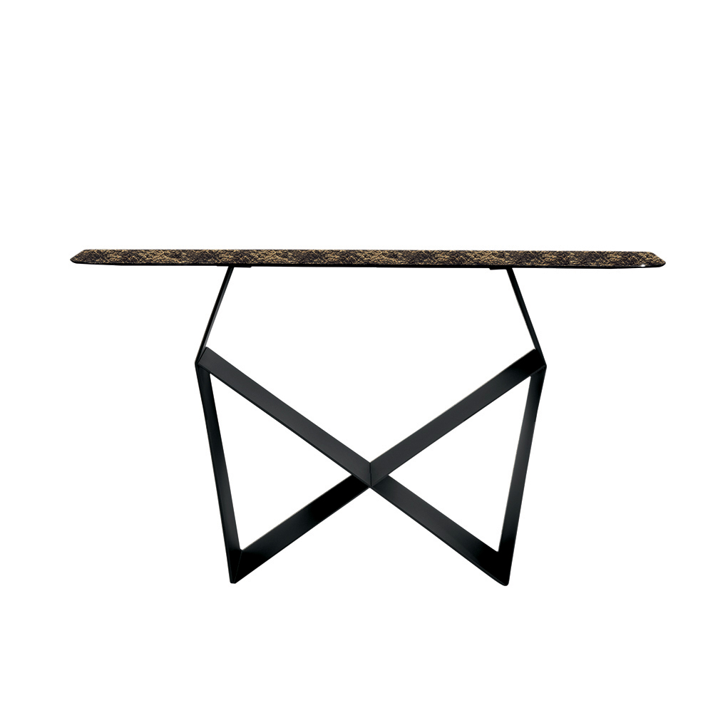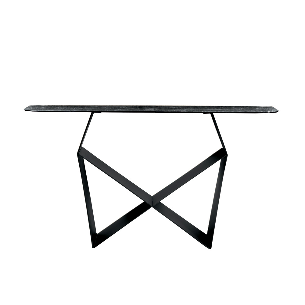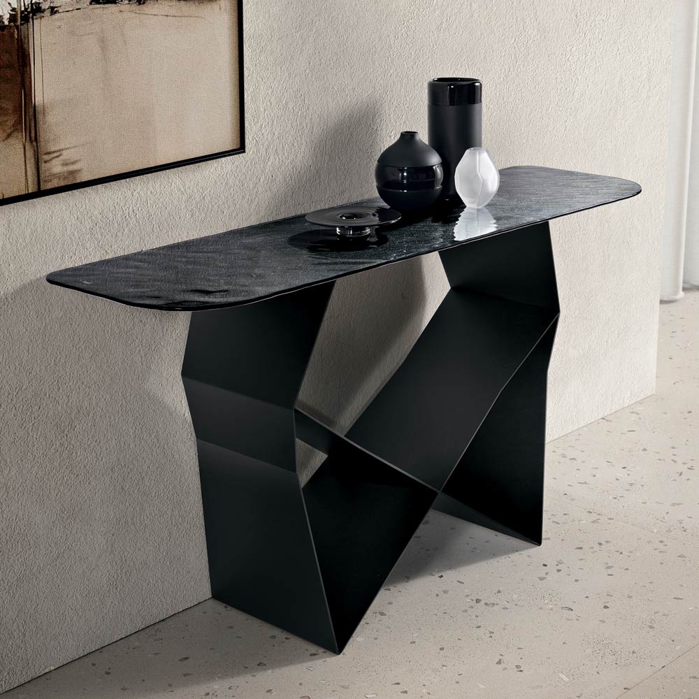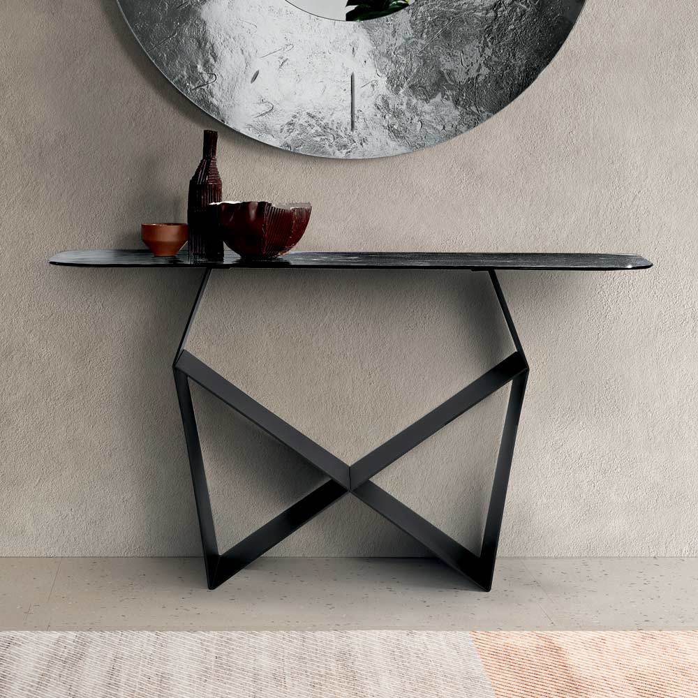A estrutura destaca-se pela sua base de metal pintado que cria um formato original de gravata borboleta , gerando uma interação refinada entre sólidos e vazios. Este detalhe confere dinamismo e dinamismo à composição, dando ao console uma presença marcante e, ao mesmo tempo, equilibrada.