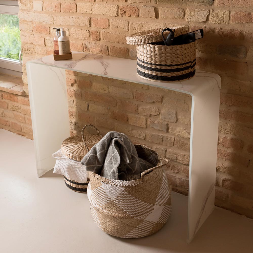 Ideal para decorar entradas, corredores ou salas de estar, esta mesa de consola combina leveza visual e solidez estrutural, tornando-se um acessório de mobiliário decorativo e funcional.