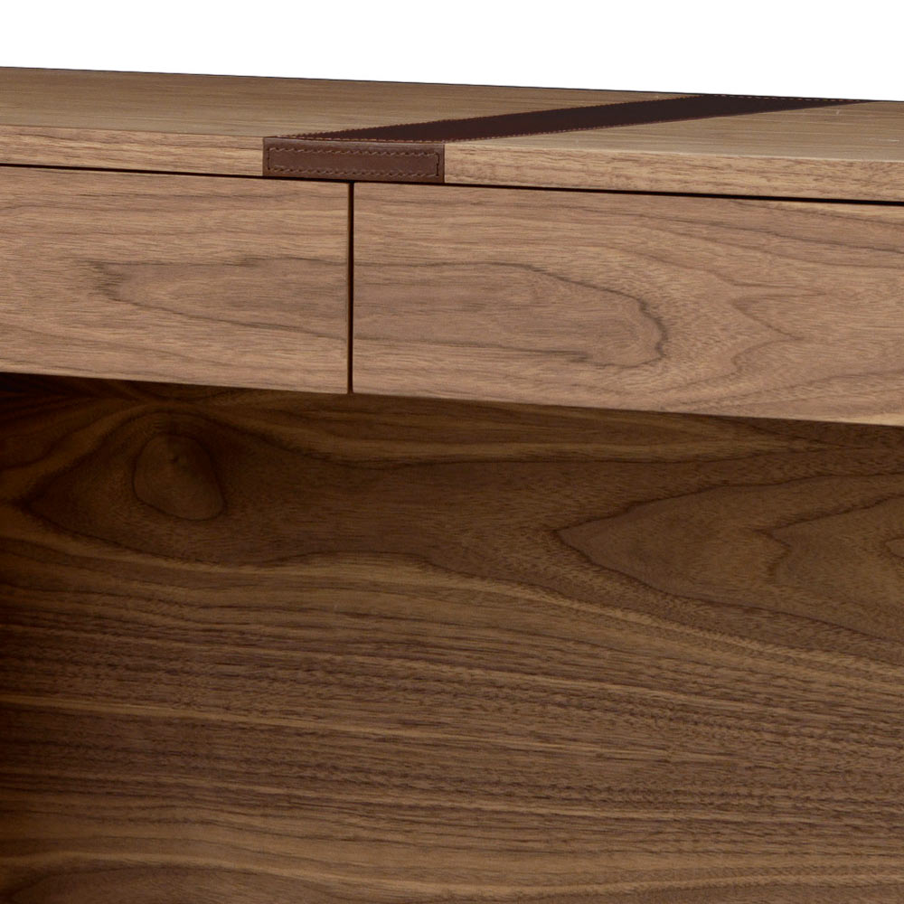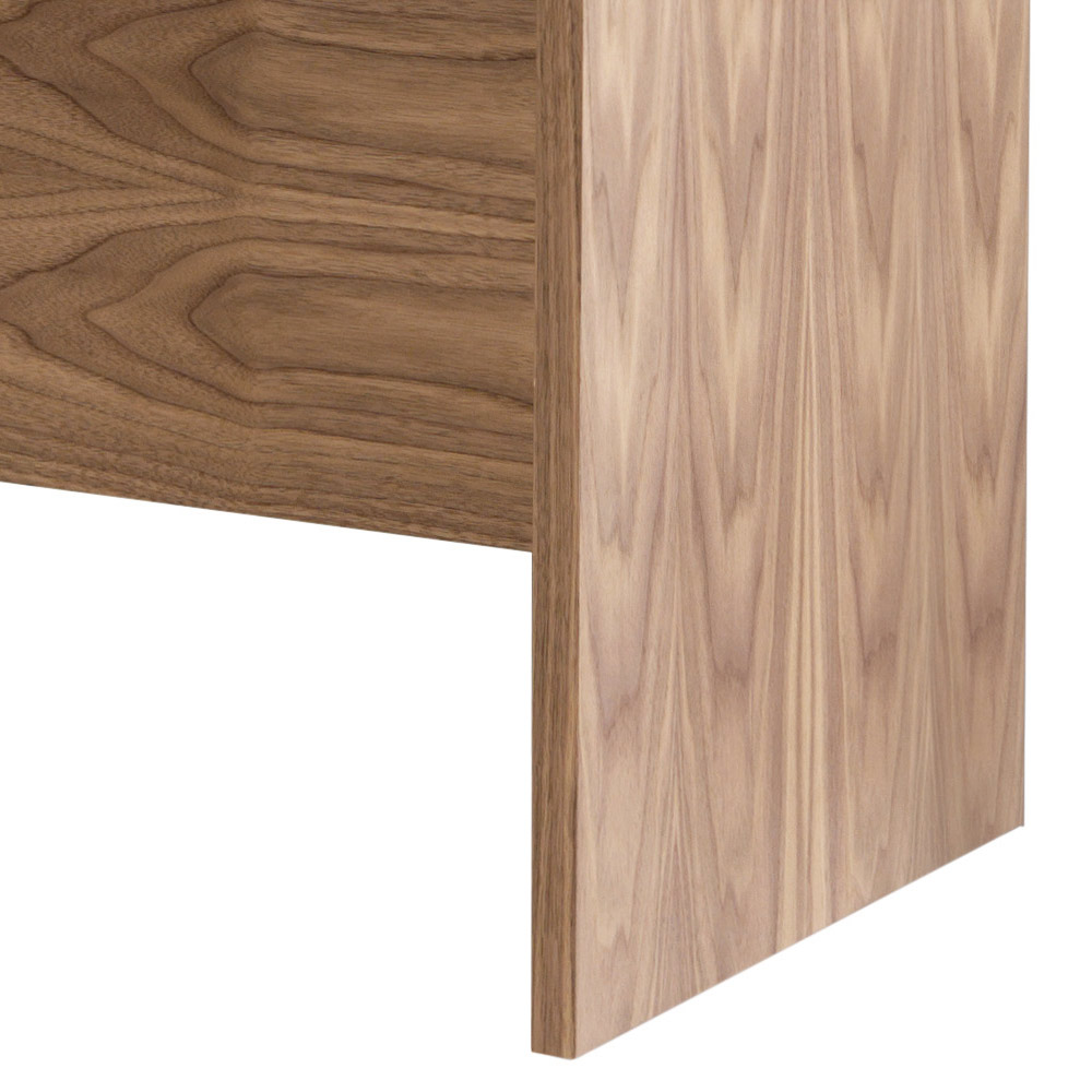 Feita de contraplacado curvo revestido em nogueira canaletto com inserções frontais em couro natural.