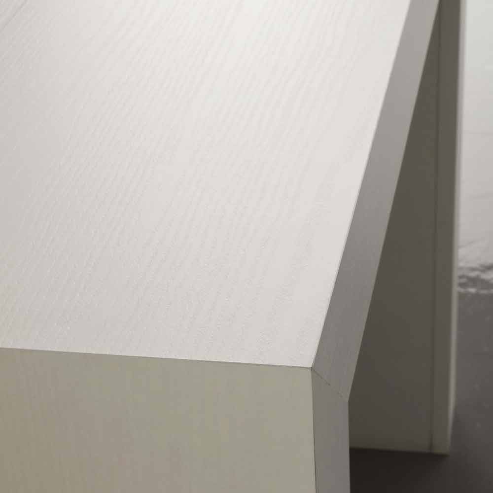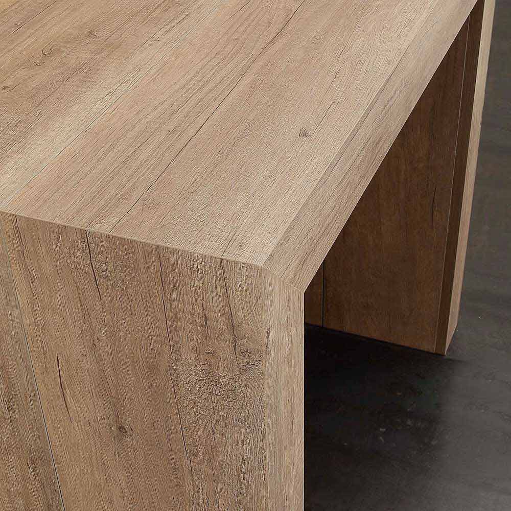 Uri é fabricado em painel melamínico, disponível nos acabamentos carvalho nodoso, carvalho riscado e poro aberto branco. As extensões devem ser armazenadas fora da mesa do console.