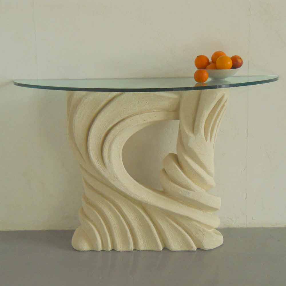 A mesa de console Emera é inteiramente feita na Itália . Sua base é feita de pedra natural Vicenza e foi esculpida à mão a partir do bloco de pedra original. O tampo da mesa é feito de cristal float (15 mm de espessura), colocado na base.