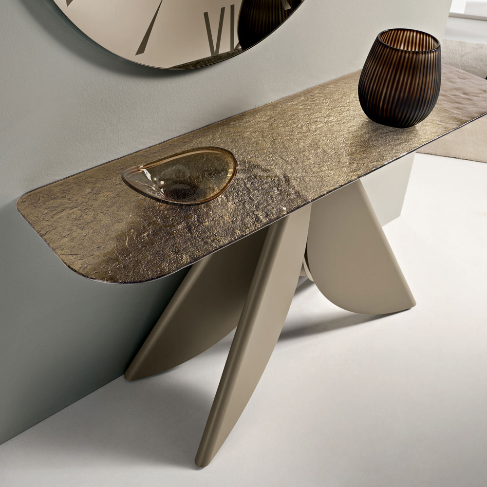 O tampo de vidro martelado com revestimento prateado na parte traseira adiciona brilho e profundidade visual graças à sua textura que reflete a luz com efeitos iridescentes, tornando a superfície elegante e distinta.
