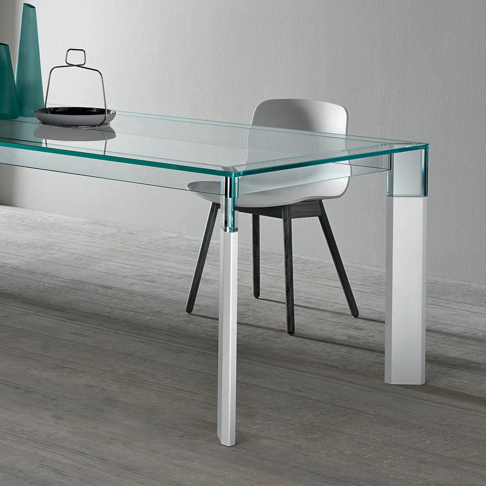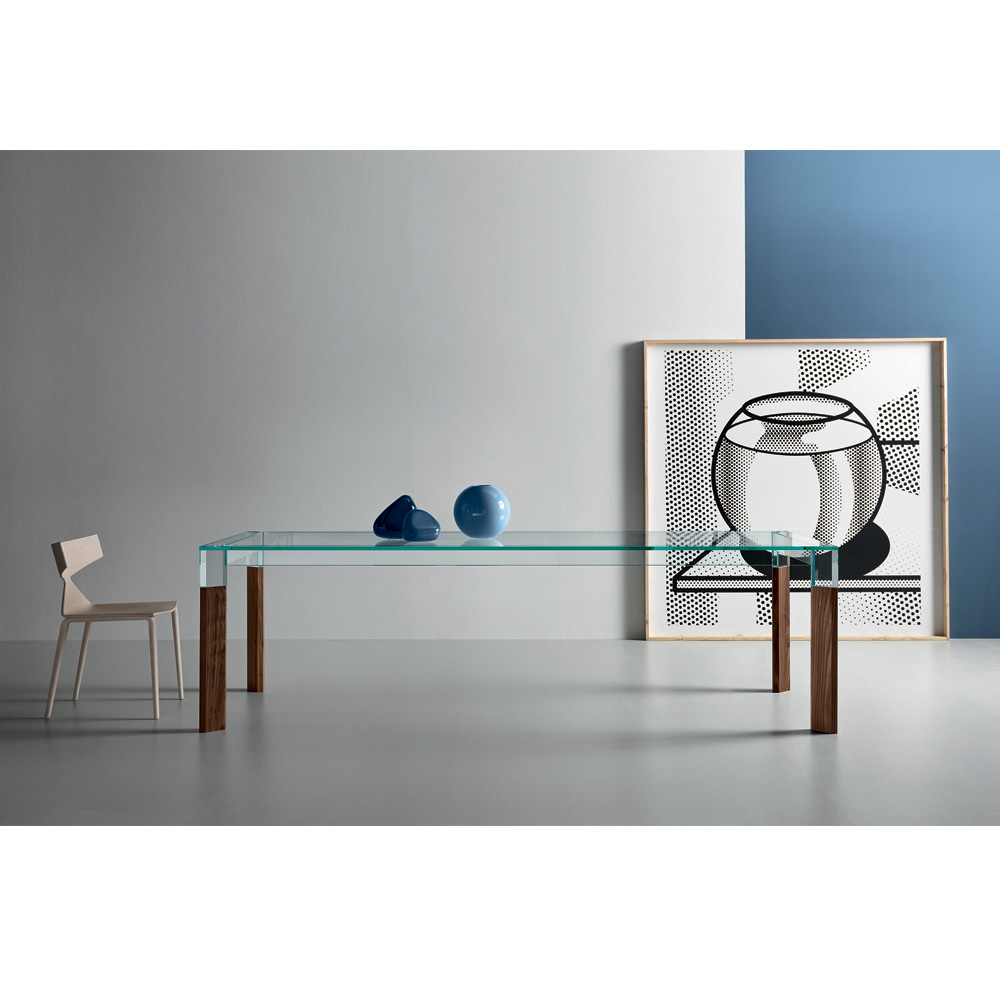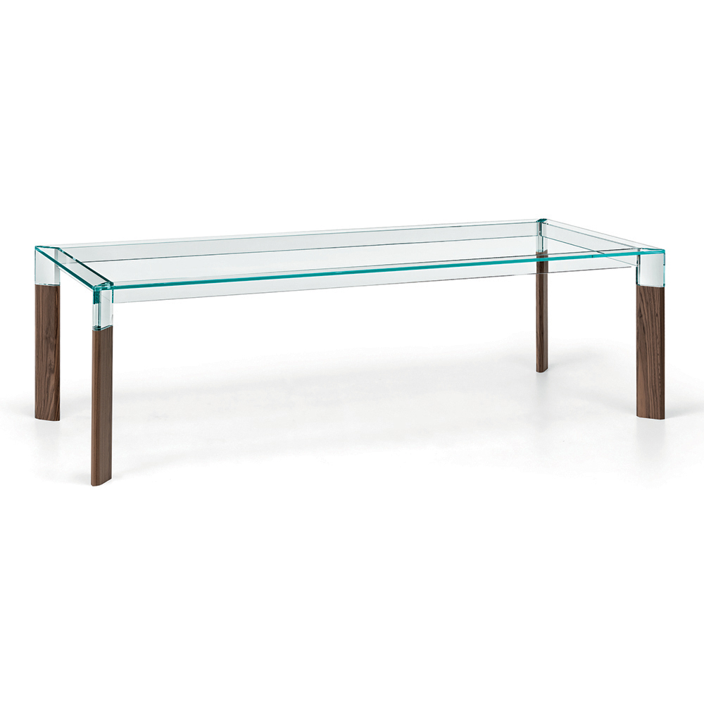 Mesa de cozinha com tampo em vidro e pés em madeira Made in Italy.