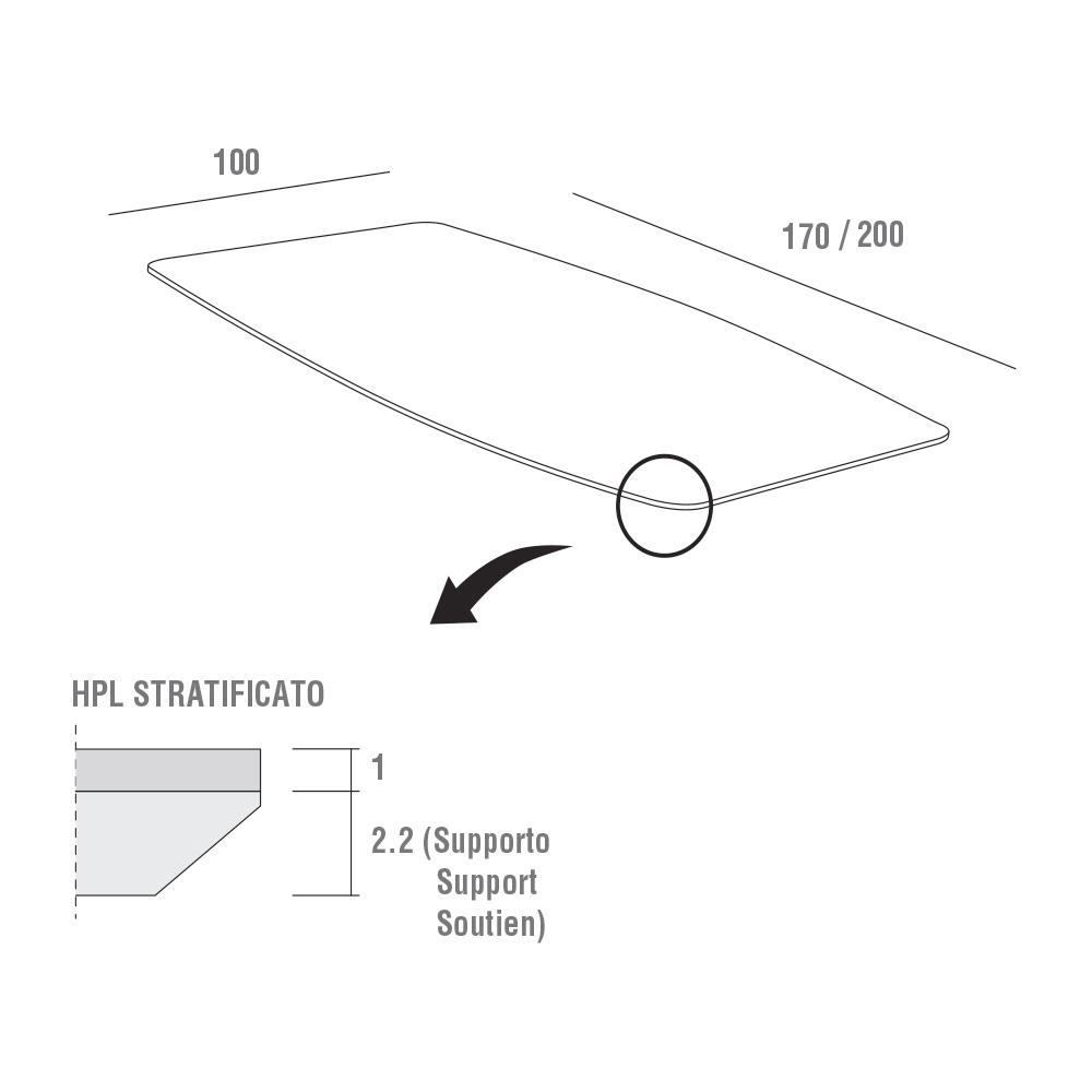 Mesa de cozinha com tampo em hpl estratificado (espessura 10 mm) estratificado em forma de barril e apoiado em placa de mdf e