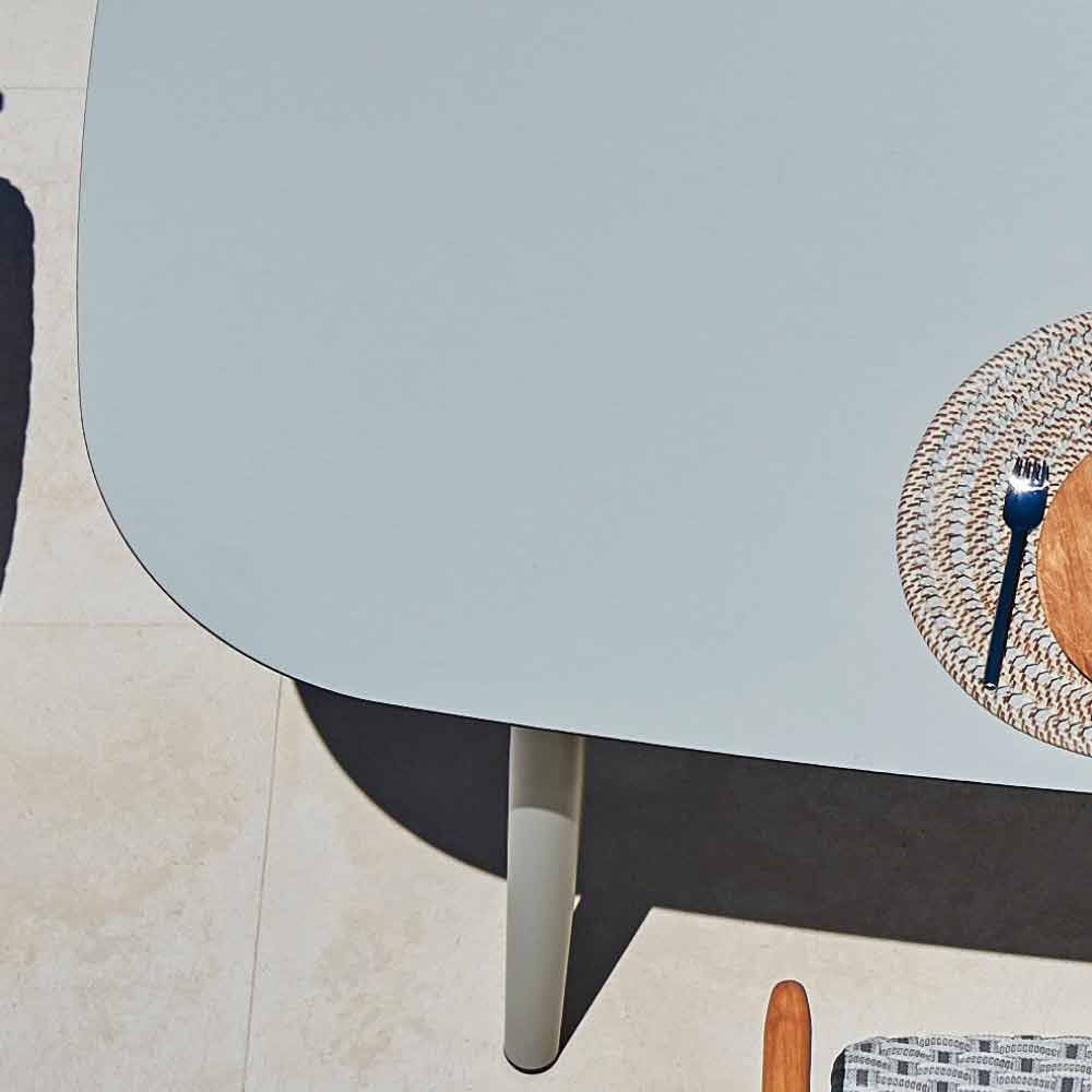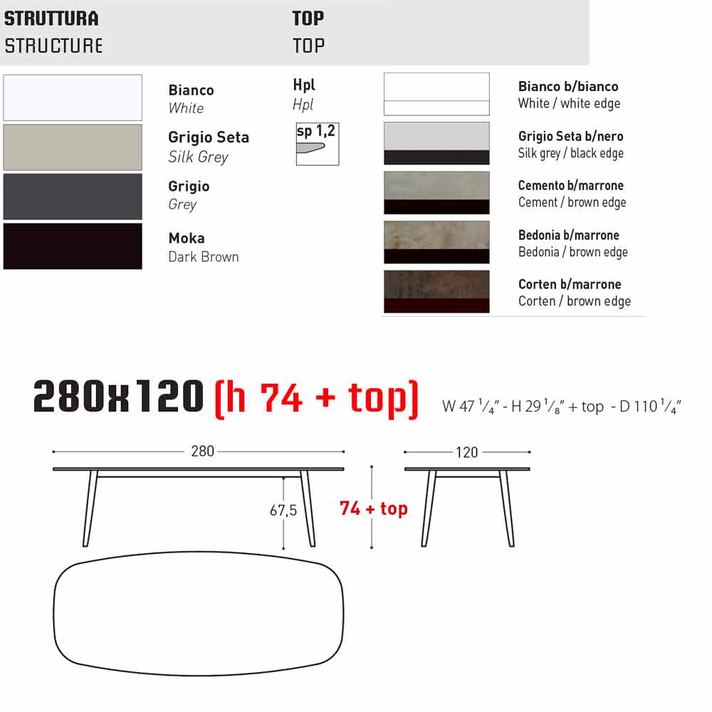 Ellisse é uma mesa fixa externa com uma estrutura de alumínio com revestimento em pó para escolher entre quatro cores: branco, cinza-seda, cinza e moka ; com topo em HPL (sp 1.2) em acabamento: borda preta cinza-seda, borda preta branca, borda preta antracite, borda branca e branca, borda marrom cemento, borda bedonia marrom, borda marrom corten ; ou com um tampo de cerâmica (sp 1.2) no acabamento: cal branca e pórfiro cinzento .
