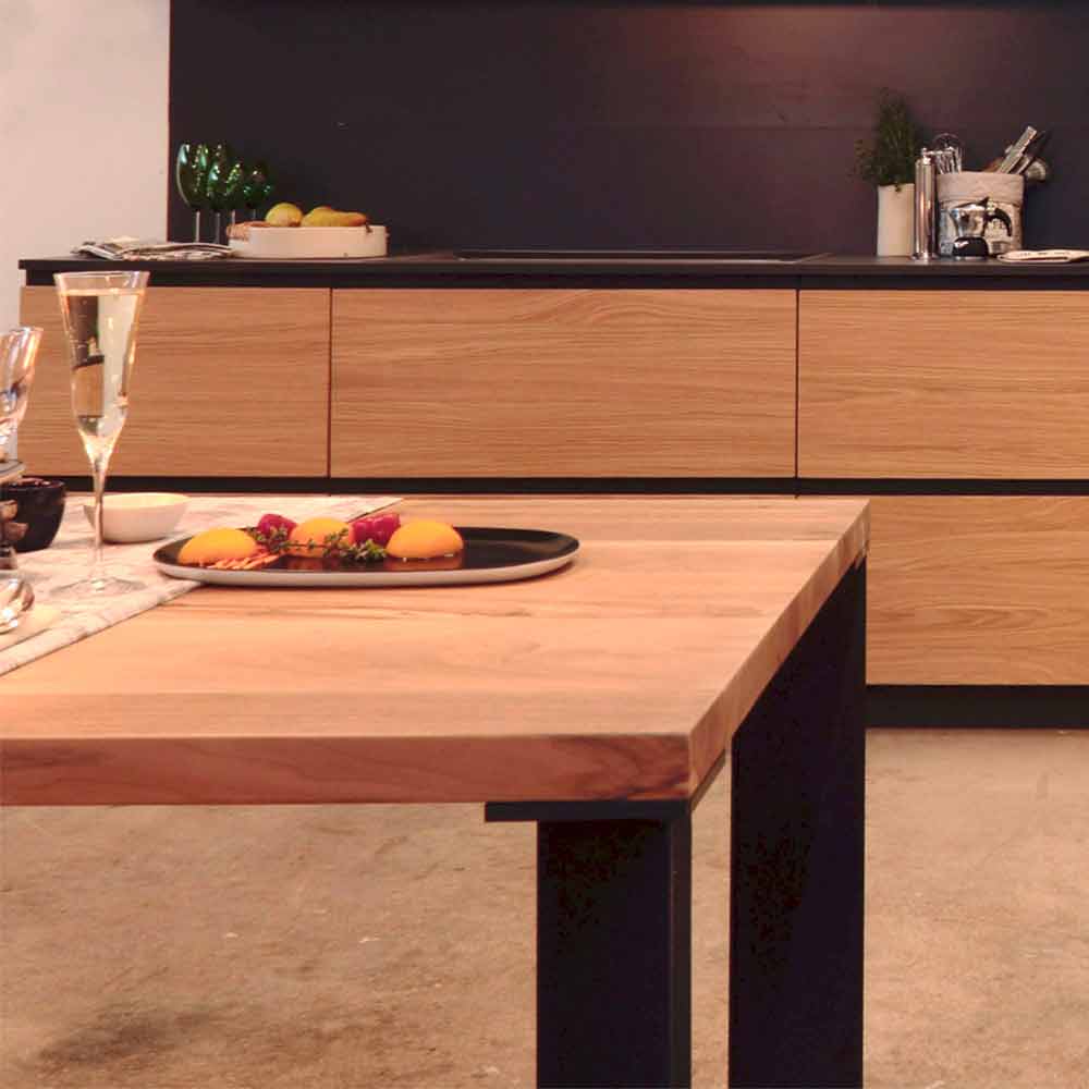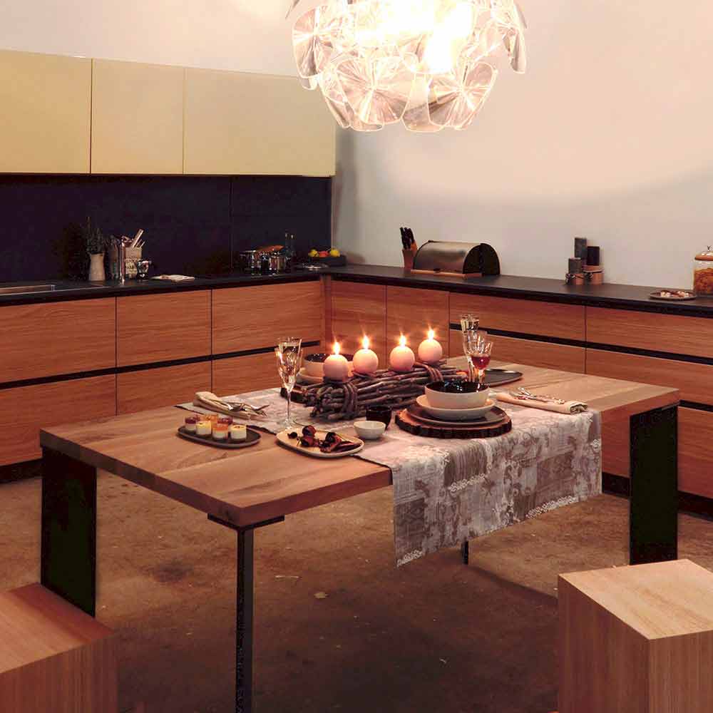 Uma tabela com linhas essenciais que interpreta a geometria mais básica. A característica peculiar são as pernas posicionadas na diagonal, em comparação com as linhas do topo. Combinações decisivas entre a simplicidade e a leveza das formas e a solidez do material: nogueira nacional sólida e metal revestido a pó.