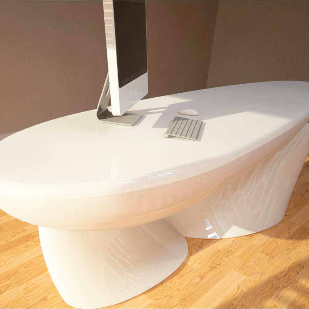 Com formas sinuosas e ao mesmo tempo decisivas e importantes, a pedra macia representa 3 enormes pedras apoiadas sobre si mesmas que dão vida a uma mesa de escritório.