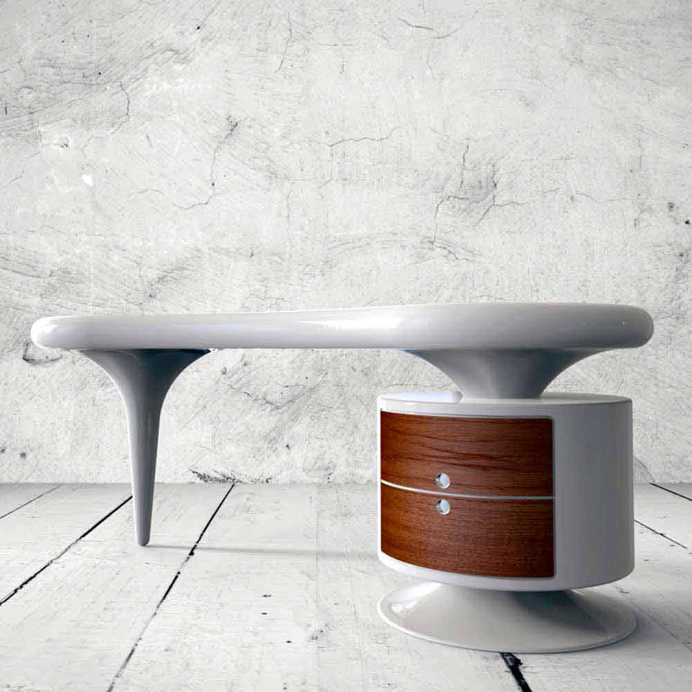 O cone caracteriza formalmente a secretária e, enquanto por um lado suporta levemente o tampo moldado, por outro torna-se o elemento de sustentação da cómoda.