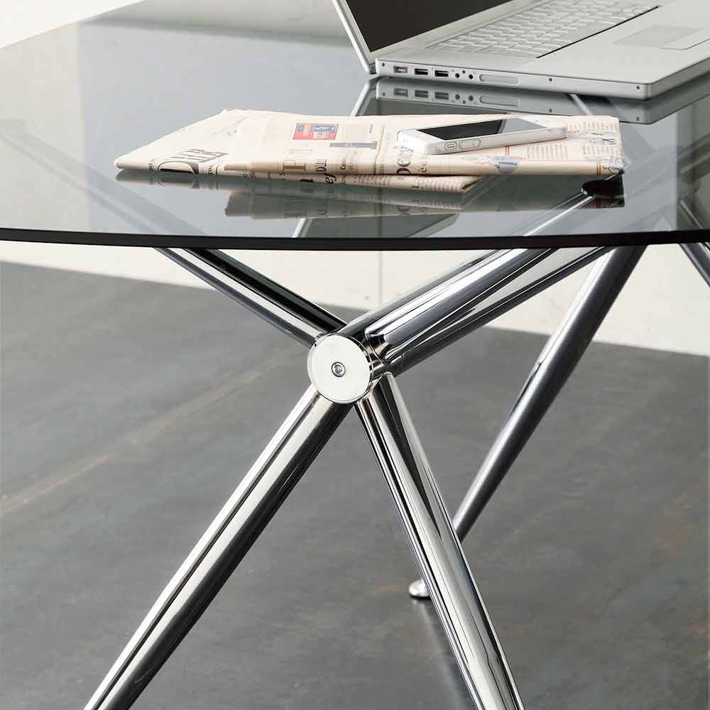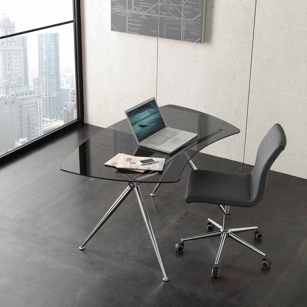 Mesa de escritório fabricada na Itália com tampo em vidro moldado (10mm de espessura) e estrutura metálica com acabamento cromado.