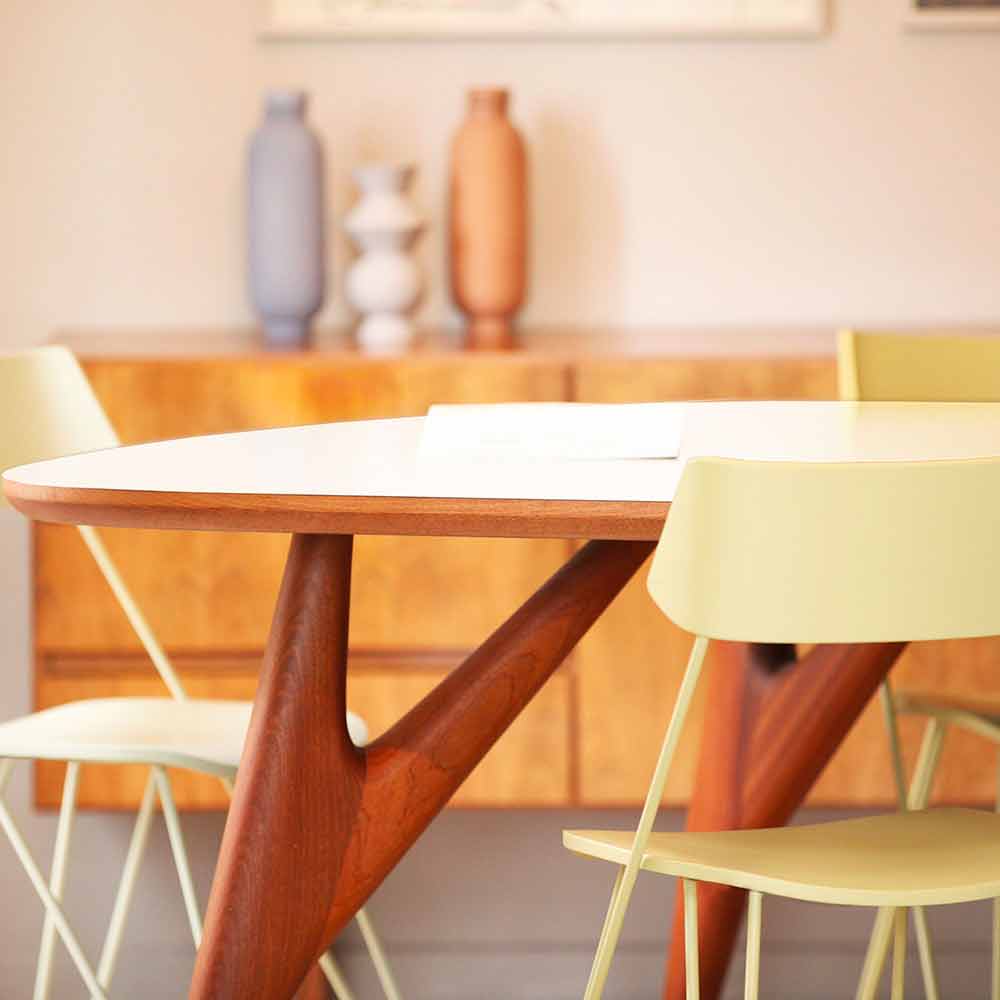 Mesa de jantar moderna e original inteiramente feita à mão na Itália com tampo em laminado HPL e estrutura em madeira maciça de mogno.
