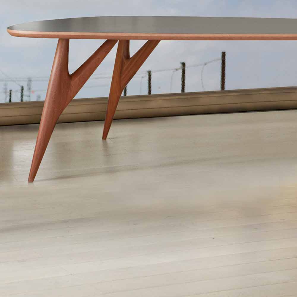 A elegância intemporal da madeira maciça alia-se à modernidade do HPL para dar vida a uma solução de mobiliário com um estilo inigualável capaz de se adaptar a qualquer ambiente, trazendo consigo um toque criativo e elegante e tornando-se no verdadeiro protagonista do interior da divisão . Da escolha de usar matérias-primas de alta qualidade e de alta qualidade habilmente trabalhadas por artesãos experientes , nasce uma ideia revolucionária de mobiliário, caracterizada pela delicada forma de vela do tampo e o garfo original das pernas que enriquecem o design. Estas peculiaridades permitem à mesa transmitir uma sensação de leveza e ao mesmo tempo criar uma harmonia incrível com o mobiliário envolvente, conquistando assim todos os espaços.