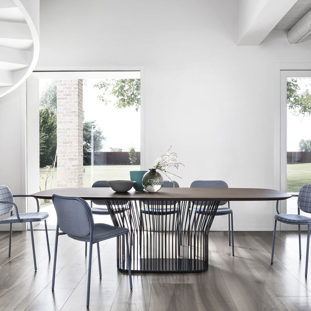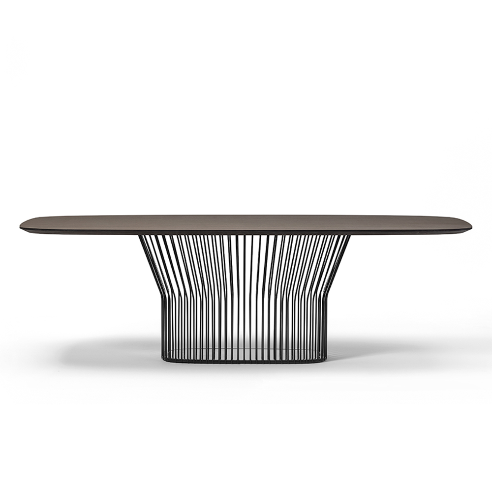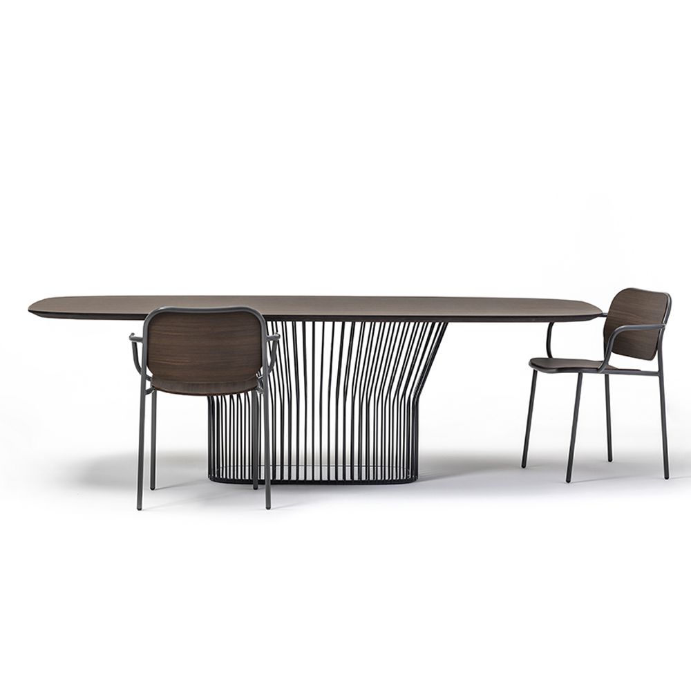 estilo dinâmico e composta por muitos raios de diferentes larguras que se dobram para fora no topo e depois se abrem para apoiar o tampo. As dimensões propostas em conjunto com os diferentes acabamentos para o tampo permitem que este maravilhoso móvel se revele particularmente versátil e, portanto, capaz de completar qualquer espaço, conquistando o centro das atenções pela sua alma contemporânea e pelo seu gosto requintado.