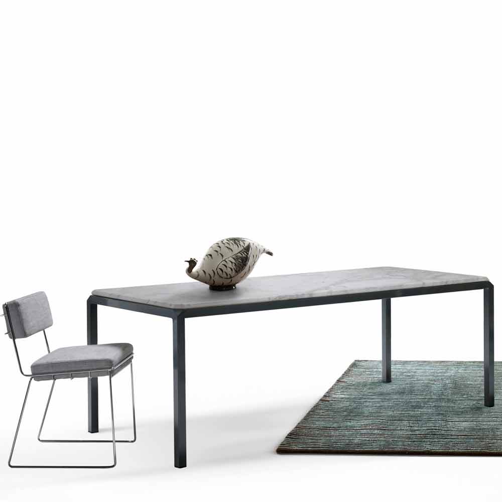A atenção meticulosa aos detalhes, a qualidade do acabamento, o contraste entre a estrutura em ferro e o tampo em mármore identificam a mesa Bebop.