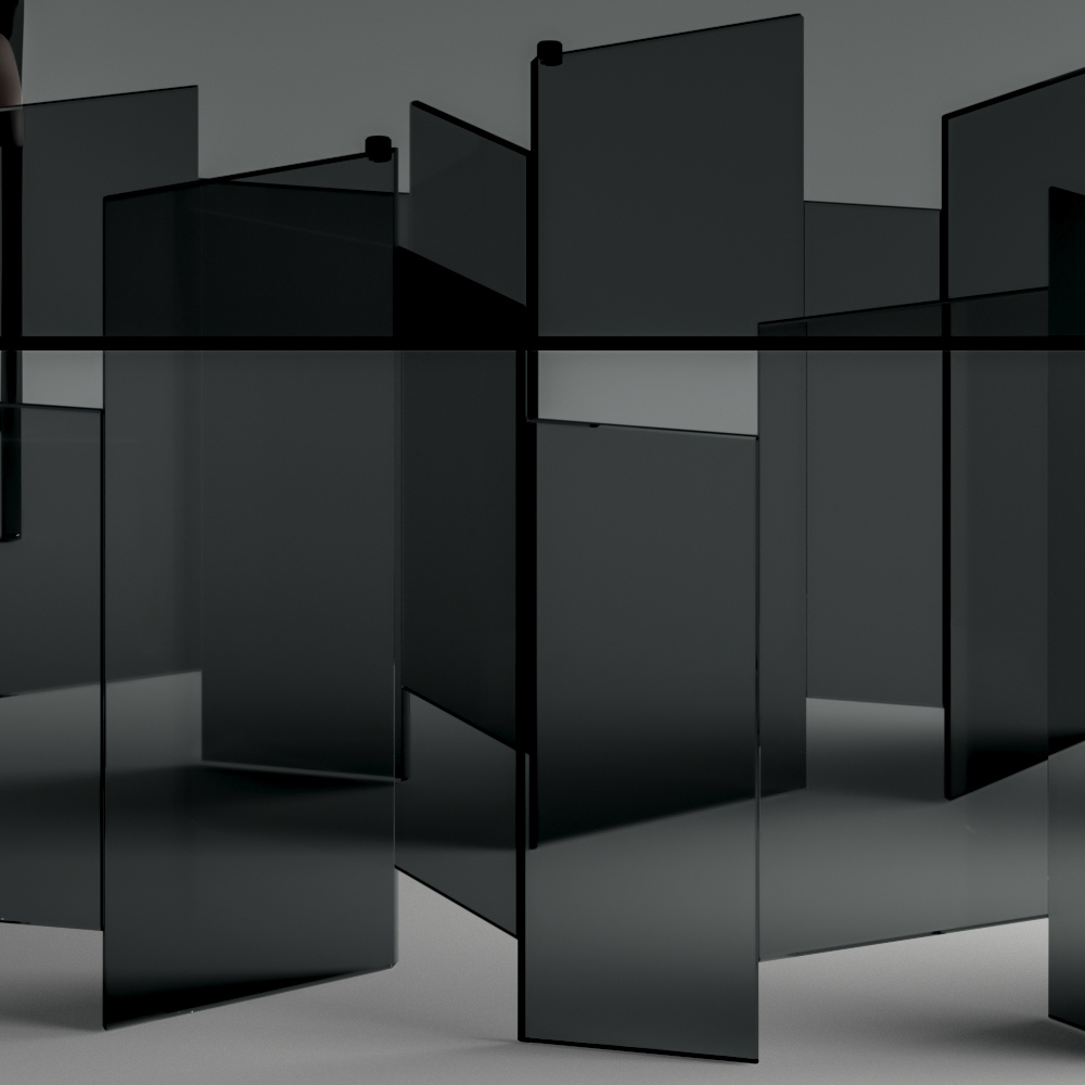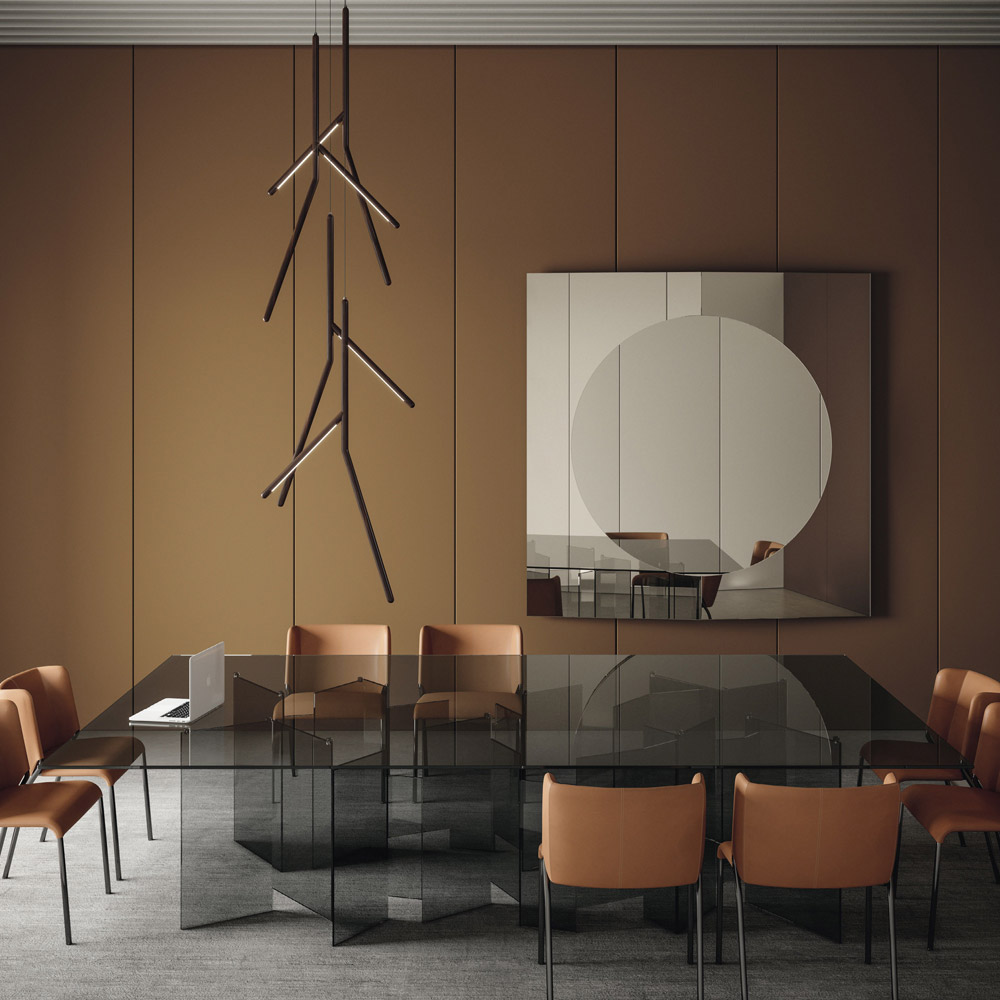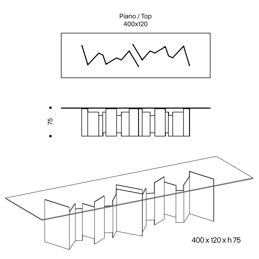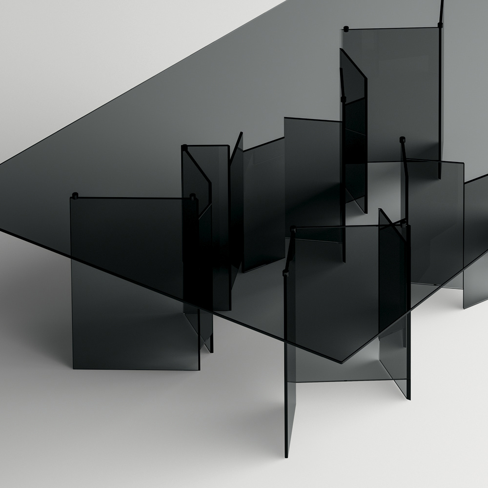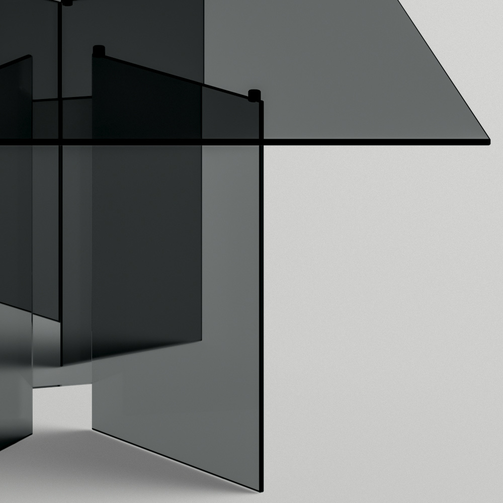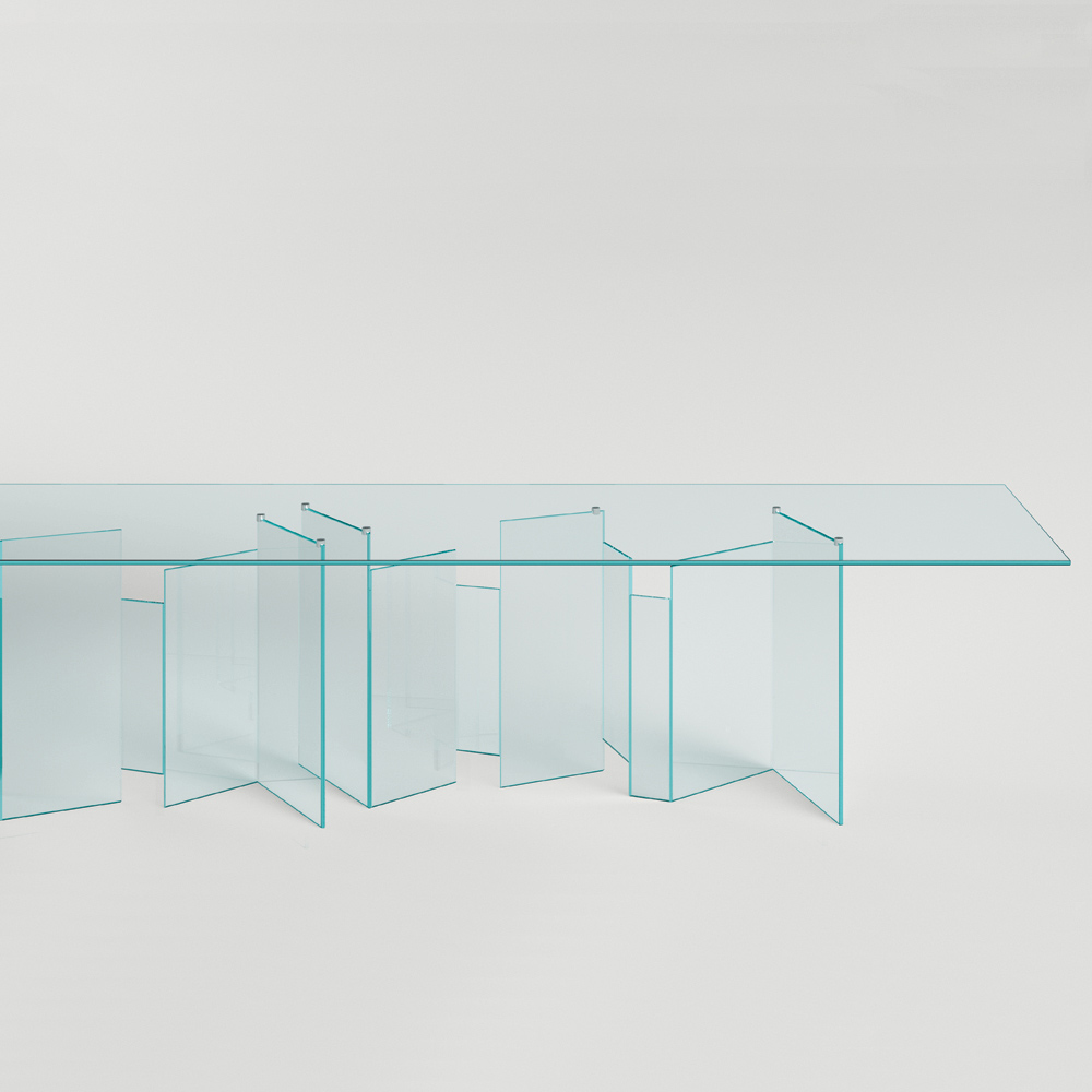 A escolha de um material simples como o vidro mas ao mesmo tempo de forte impacto visual caracteriza toda a estética do produto tornando-o original , contemporâneo e elegante , ideal para quem procura uma solução de decoração capaz de completar a zona de estar do seu a casa com personalidade moderna e imponente . Visualmente o que chama a atenção é, sem dúvida, a forma particular da base que é composta por inúmeras placas de vidro unidas assimetricamente para dar à mesa uma sensação de dinamismo aliada a um toque exclusivo e requintado .