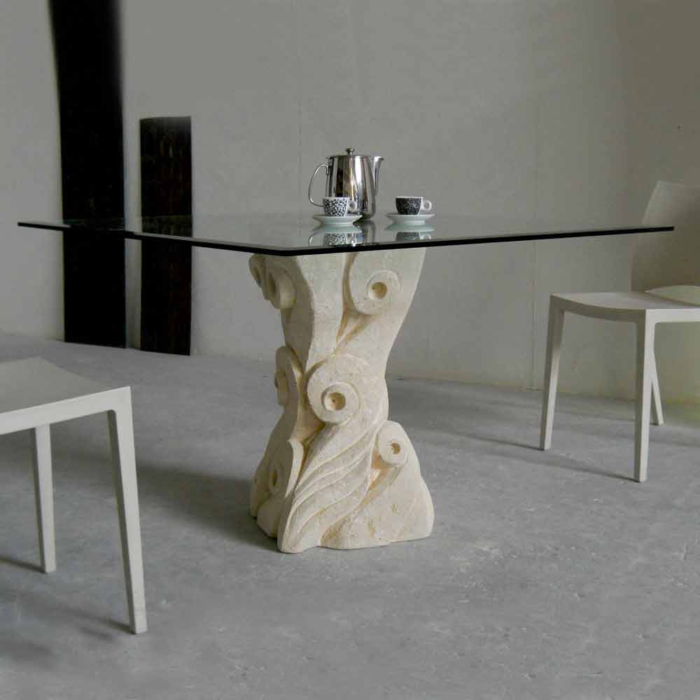 Mesa de jantar com tampo de cristal e base em pedra Giasone, fabricada na Itália