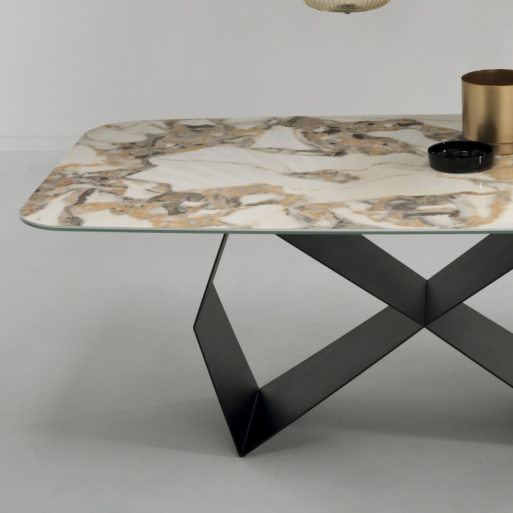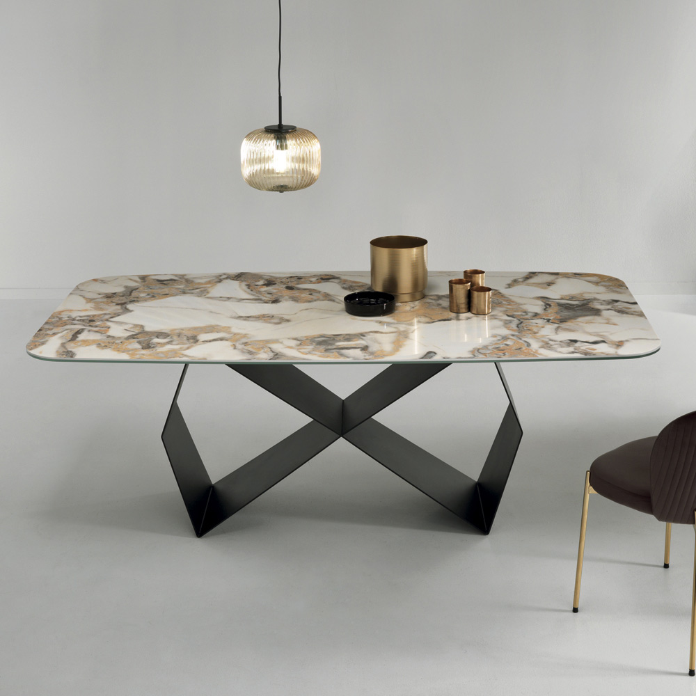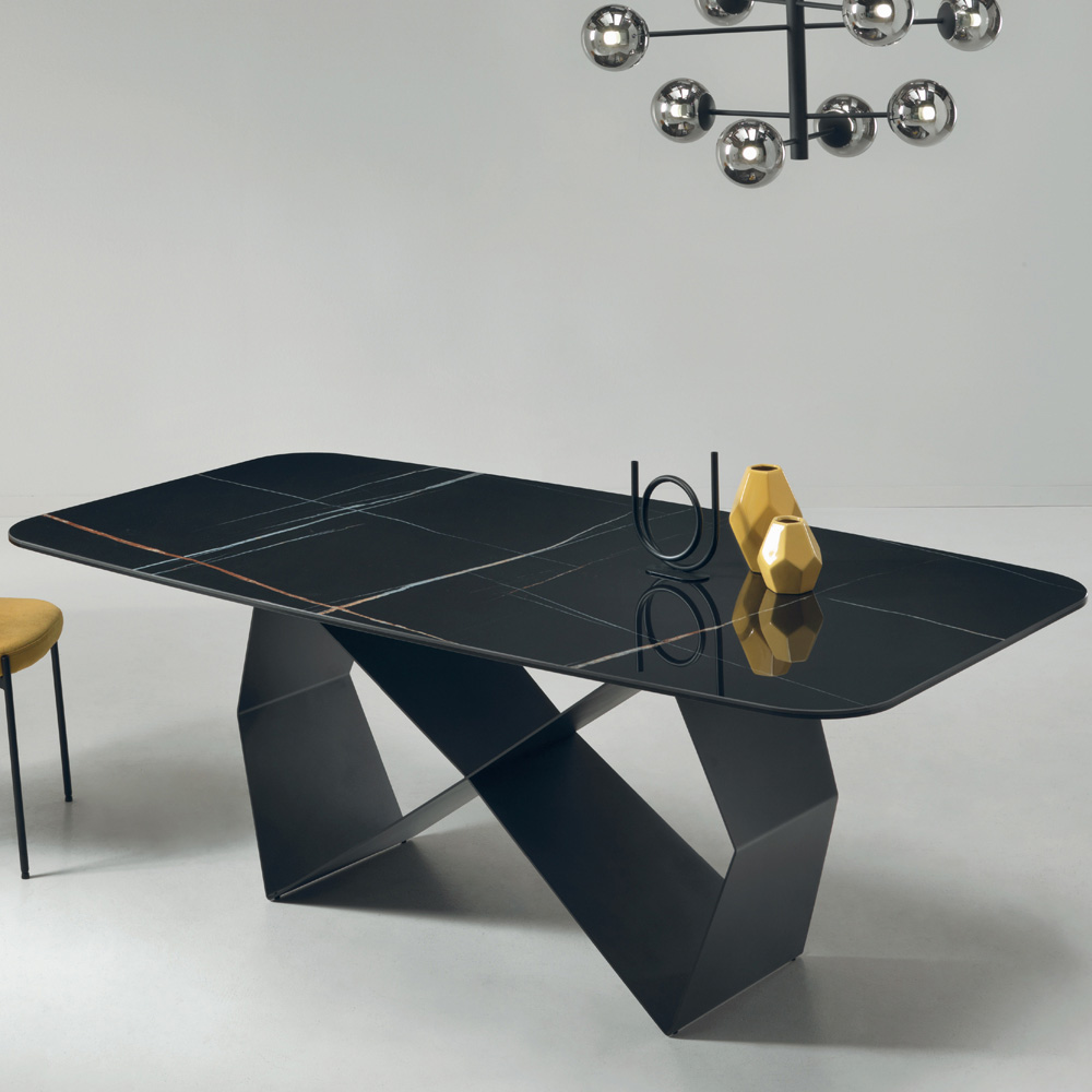 Mesa de jantar em cerâmica com efeito mármore e metal preto Fabricado na Itália.