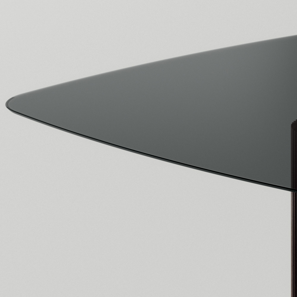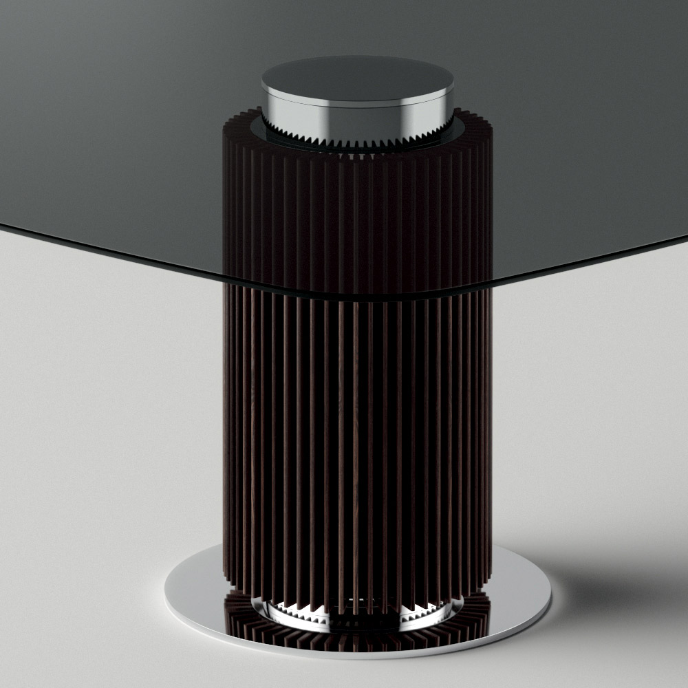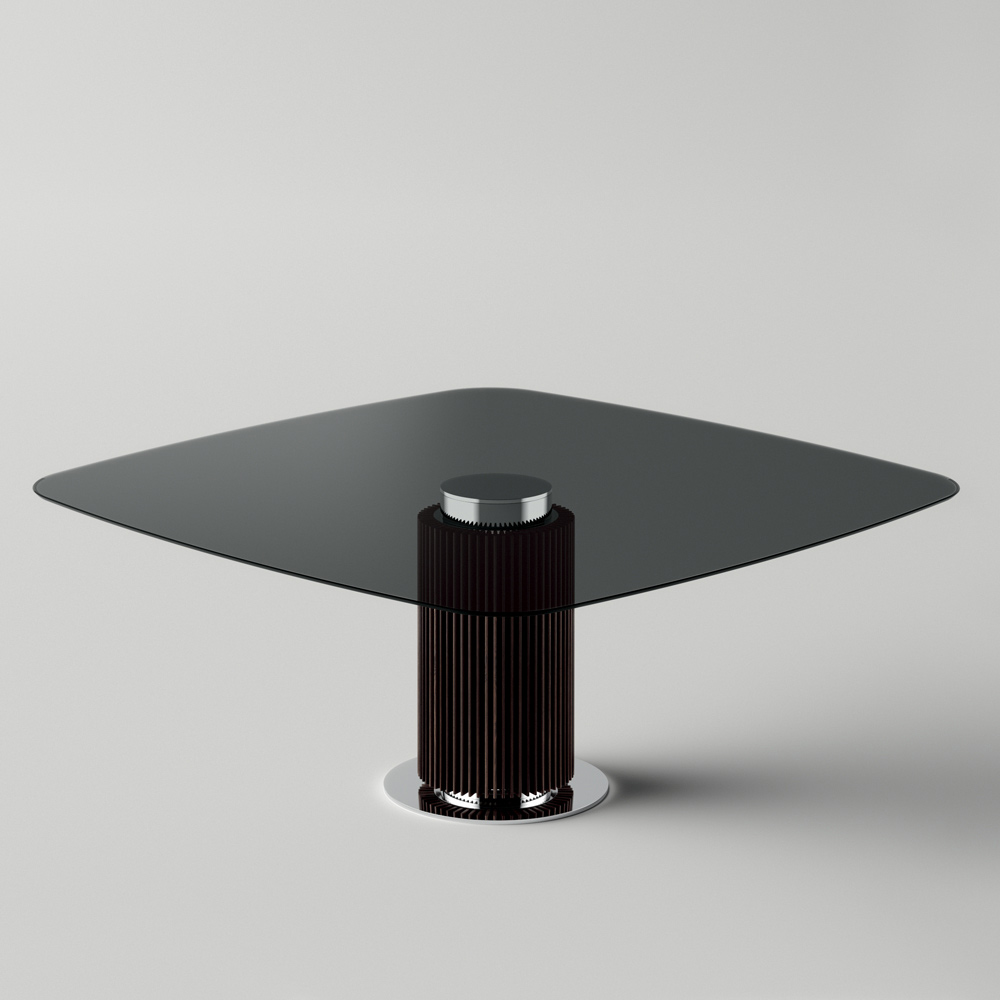 Mesa quadrada com tampo de vidro fumê e base de madeira Fabricado na Itália.