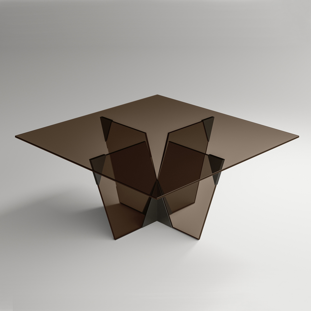 estrutura elegante e escultural que surge da combinação de materiais de diferentes naturezas aliada à paixão pelo processamento do vidro, conseguindo assim definir uma representação de força e carácter através de diferentes formas e espessuras. O ponto forte da sua estética é a base arquitetônica caracterizada por uma junta piramidal em metal que constitui a parte essencial do produto. Os elementos metálicos completam o desenho da mesa dando forma ao vidro da base e enriquecendo-o com personalidade e originalidade.