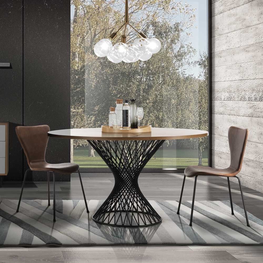 Mesa de jantar com tampo redondo em mdf folheado com acabamento em carvalho e fundo em metal pintado de preto mate . Um móvel de estilo rústico caracterizado pela forma particular da estrutura que confere ao produto uma sensação de dinamismo graças ao seu formato em espiral. Graças às suas pequenas dimensões também será possível equipar salas de jantar ou cozinhas com espaços limitados e com personalidade, sem ter que abrir mão de um toque de carácter e inovação .