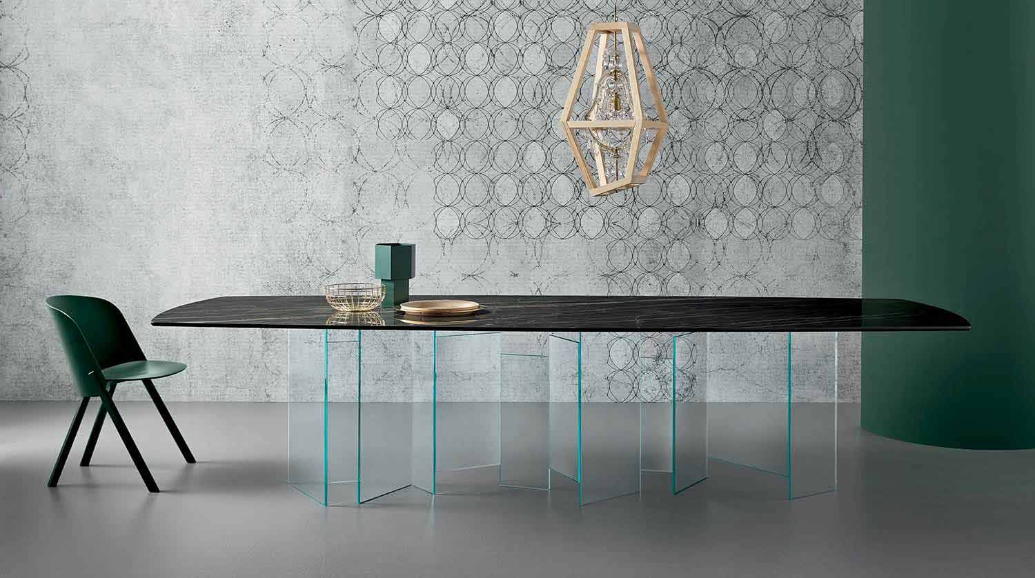 Mesa de design moderno com tampo em cerâmica e base em vidro extra claro, fabricada na Itália.