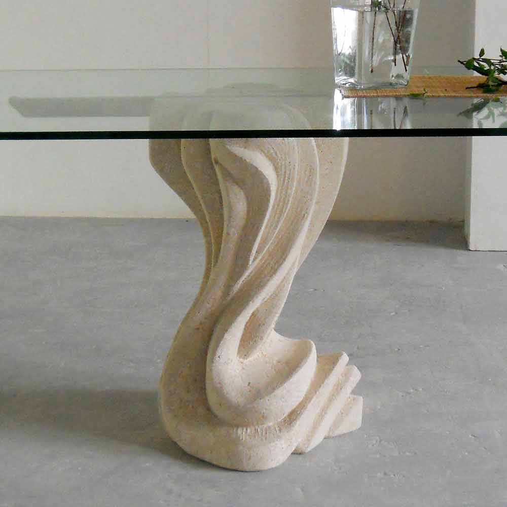 A mesa de jantar Agave é inteiramente feita na Itália. Sua base é feita de pedra natural Vicenza e foi esculpida à mão a partir do bloco de pedra original. O tampo da mesa é feito de cristal flutuante (15 mm de espessura) que é suportado por uma barra de metal escovado pintado.