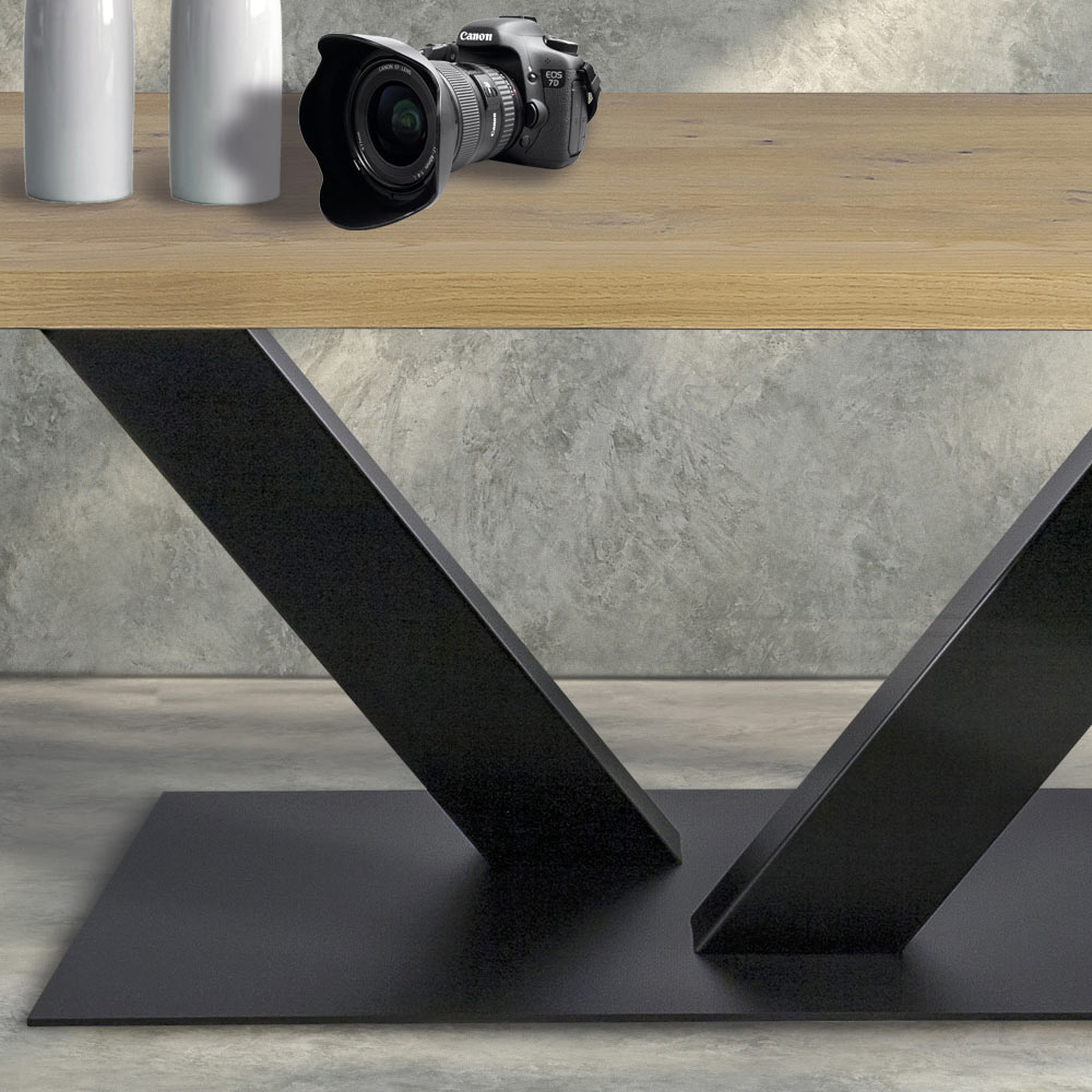 Mesa de madeira folheada a carvalho com nós e base de metal Made in Italy.
