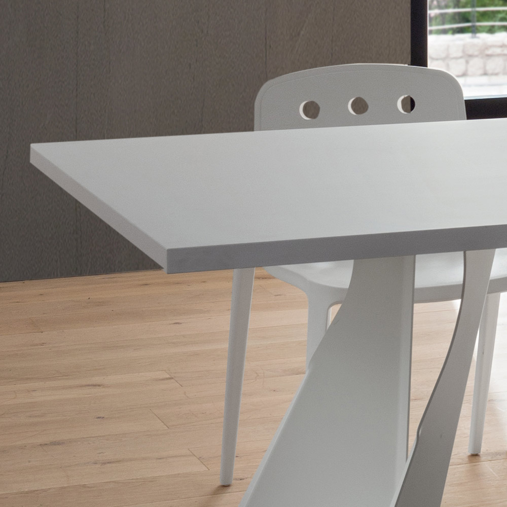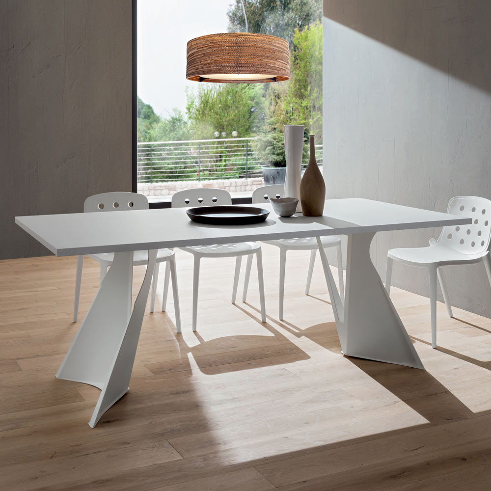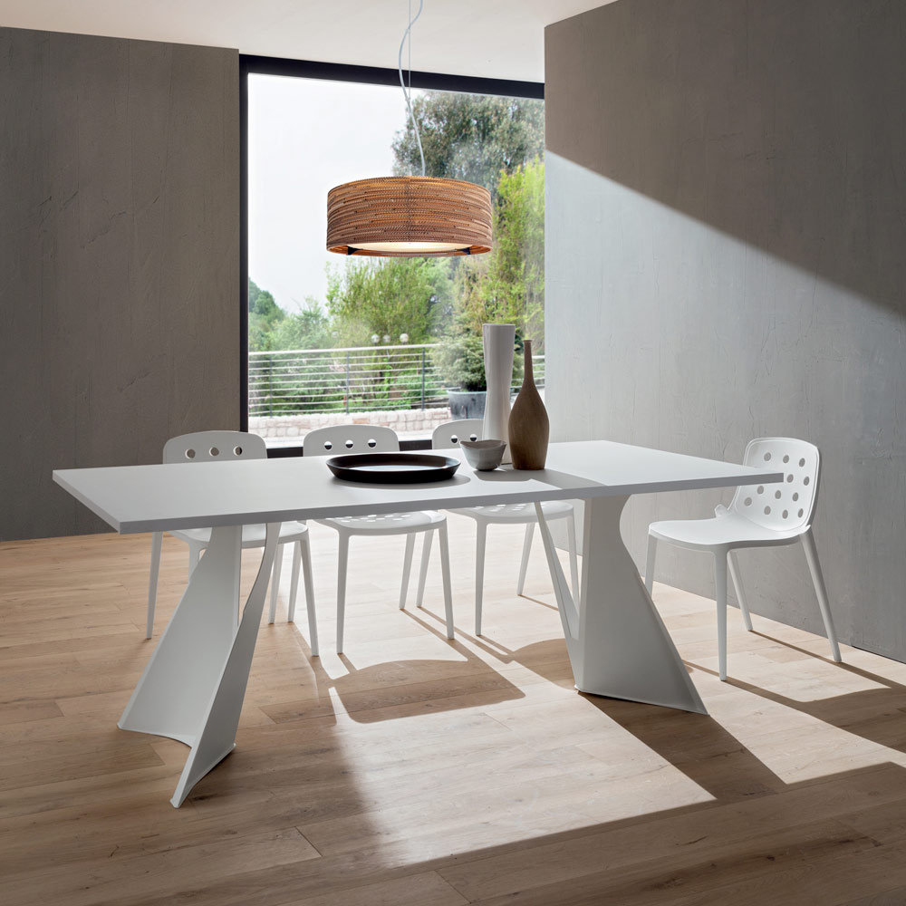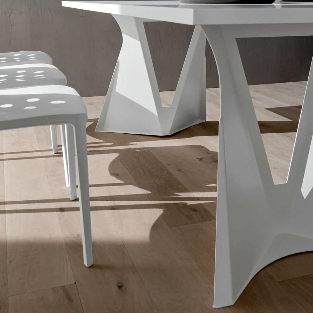 design imponente e majestoso . Esta característica enriquece a sua estética aliada à forma inusitada dos dois pés que conferem à mesa um aspeto quase futurista, tornando-a particularmente indicada para quem gosta de decorar e enriquecer os seus espaços com elementos de