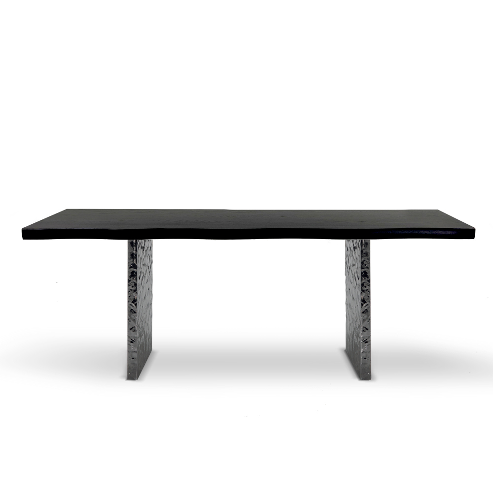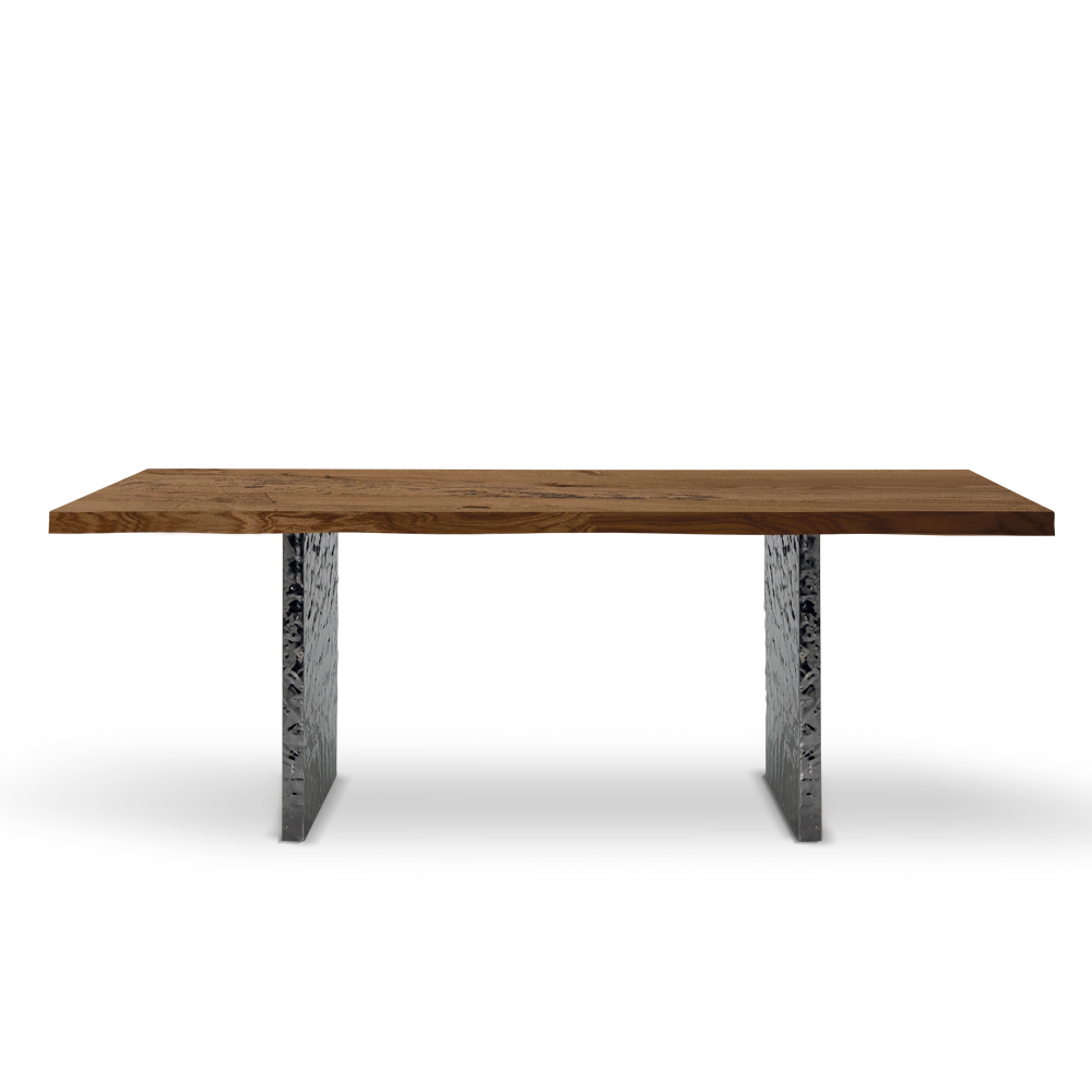 Mesa de design com tampo em madeira folheada e base em aço martelado feita à mão na Itália.