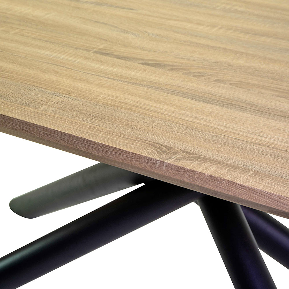 O tampo em MDF com acabamento que imita madeira natural confere aconchego e personalidade ao móvel, criando um contraste visual harmonioso com o metal escuro. A superfície lisa e espaçosa oferece o ambiente ideal para receber familiares e convidados , adaptando-se perfeitamente a qualquer espaço, da sala de jantar à sala de estar moderna , passando por ambientes comerciais como restaurantes ou escritórios.