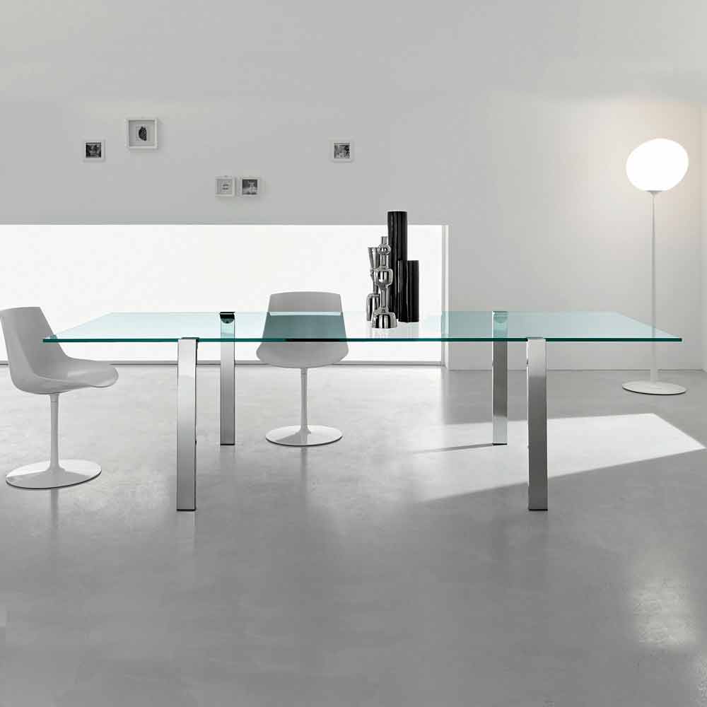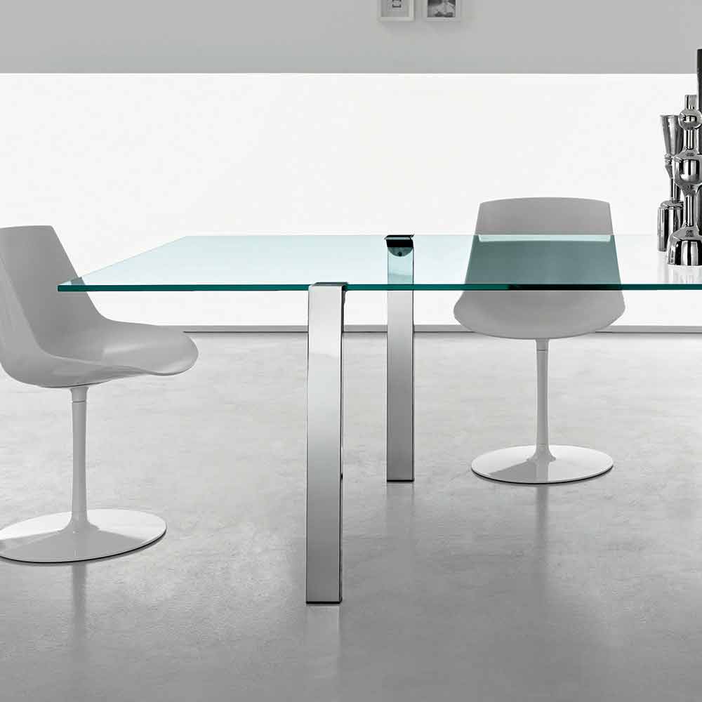 Mesa de jantar de vidro com pés metálicos de vários tamanhos e acabamentos made in Italy.