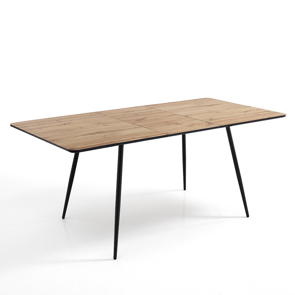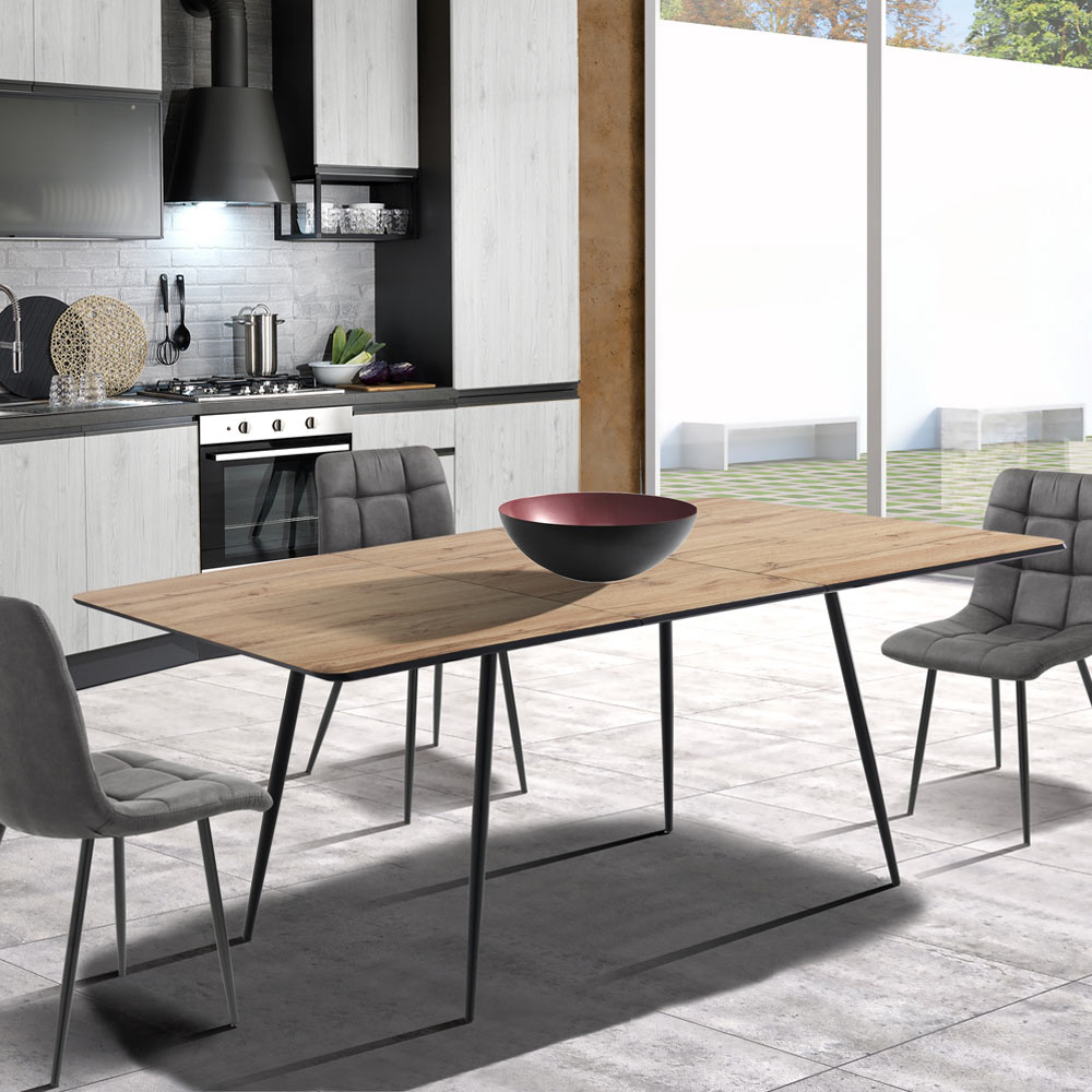 Mesa de jantar extensível até 160 cm com tampo em MDF revestido em melamina de carvalho cru com borda em preto fosco e pés em metal pintado de preto fosco . Trecho colocado sob o topo. Graças à possibilidade de ser alargado, pode acolher um maior número de amigos e familiares para passar agradáveis noites em companhia.