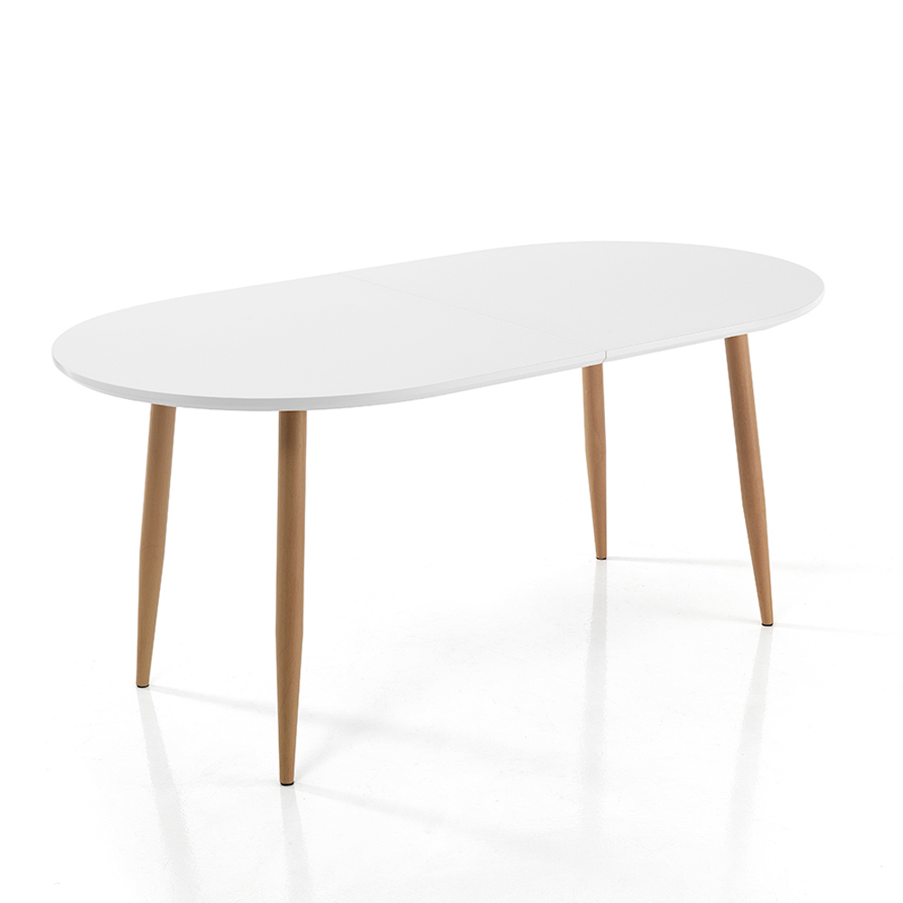 Mesa de jantar com tampo oval extensível em mdf branco mate e pés em metal com acabamento em carvalho. O tampo pode atingir 190 ou 220 cm de comprimento graças a duas extensões externas de 30 cm cada. Um produto com um estilo minimalista e grande versatilidade de utilização pensado para quem prefere mobiliário simples mas de impacto e para quem gosta de organizar almoços e jantares em companhia e por isso necessita de uma superfície espaçosa para acolher um maior número de amigos e familiares.