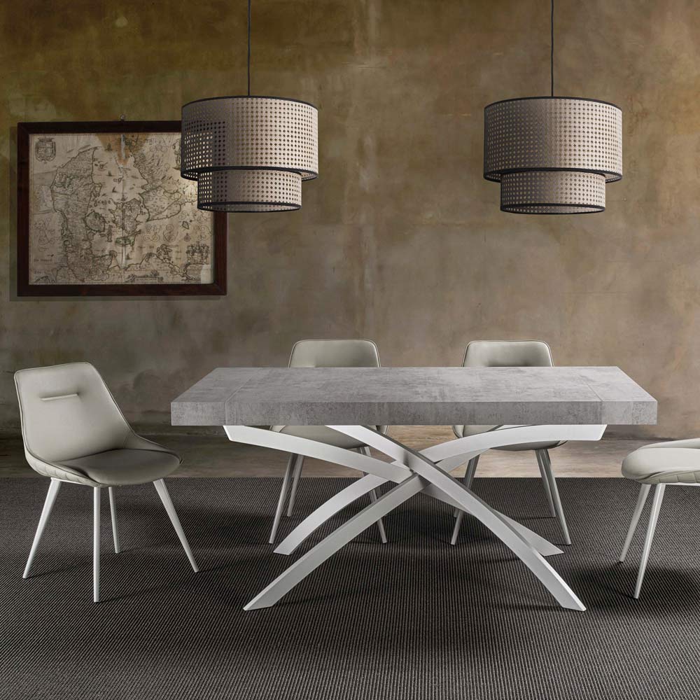madeira melamina extensível até um máximo de 260 cm graças às extensões correspondentes posicionadas sob o tampo. Justamente por esta característica é capaz de acomodar um maior número de convidados abrindo de forma extremamente simples e permitindo um fechamento igualmente fácil após o término da refeição. O seu design combina assim a