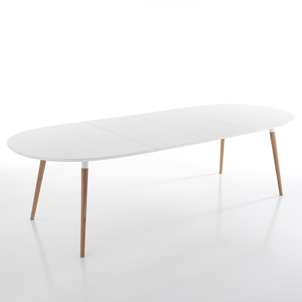 Mesa de jantar com tampo extensível em mdf lacado a branco mate e pés em madeira maciça com acabamento em carvalho . Um produto de design simples e clean, ideal para quem ama um estilo essencial e versátil de móveis, capaz de completar o estilo de sua sala de jantar ou cozinha com bom gosto e personalidade. O seu ponto forte é representado pelo tampo extensível graças a duas extensões de 50 cm cada que permitem à mesa atingir um comprimento de 220 ou 270 cm.