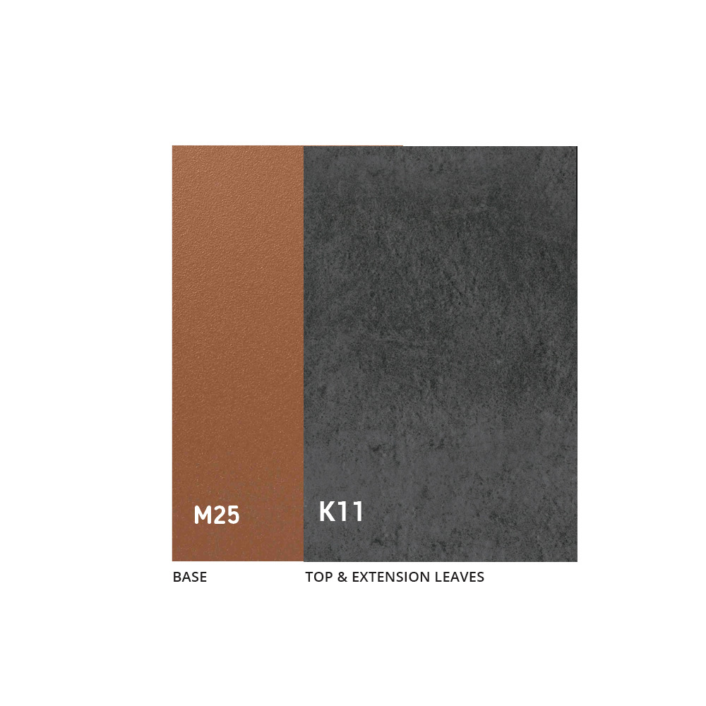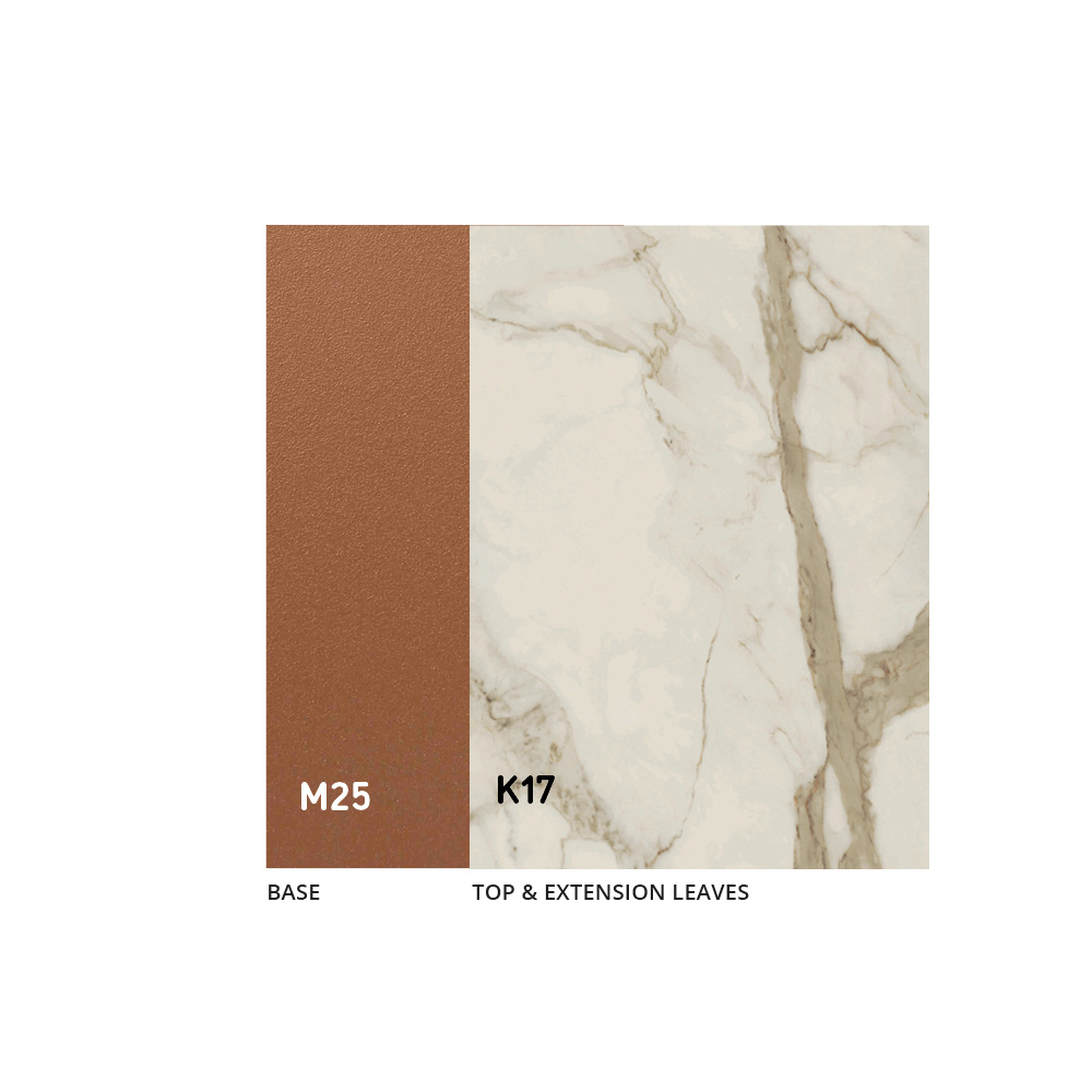 Mesa com estrutura metálica em cobre pintado e tampo de cerâmica de 3 mm.