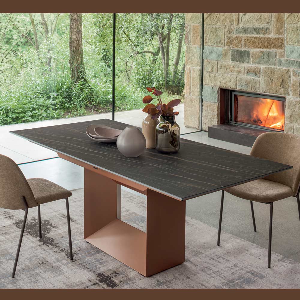 Mesa extensível para interiores, feita de cerâmica e metal. Fabricada na Itália.