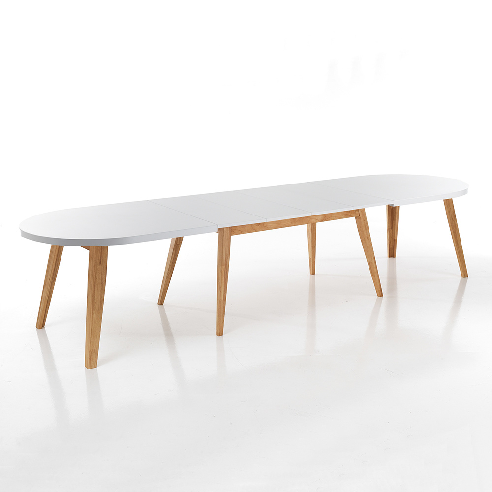 Mesa de jantar com tampo oval extensível em mdf lacado a branco semibrilhante (espessura 5cm) e estrutura em madeira maciça com acabamento em carvalho . Uma estética imponente e moderna caracterizada por formas simples para um resultado com elevada versatilidade de utilização . O seu lado funcional é sublinhado e realçado pelas 4 extensões de 30 cm cada uma posicionadas por baixo do tampo que permitem à mesa atingir um comprimento máximo de 300 cm. Esta funcionalidade torna-o perfeito para quem adora organizar almoços e jantares em companhia e, por isso, necessita de um espaço que possa acolher da melhor forma todos os seus convidados.
