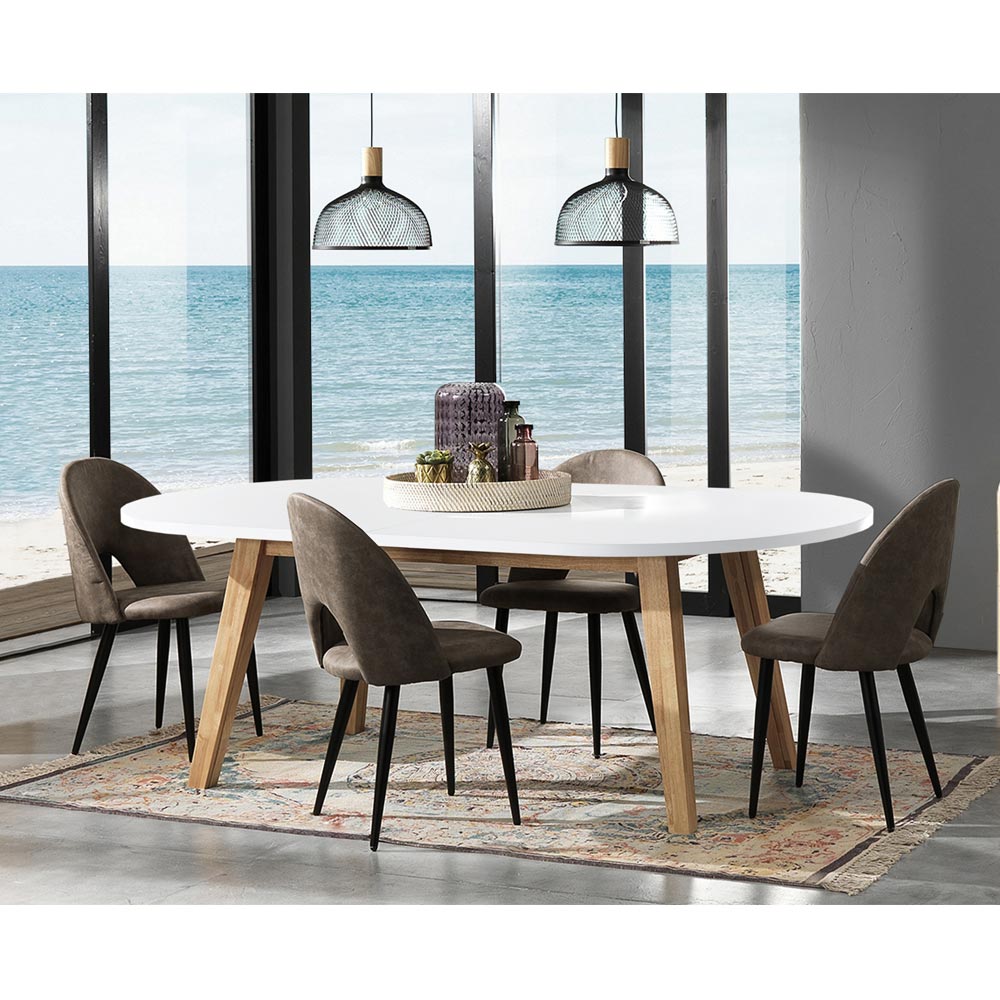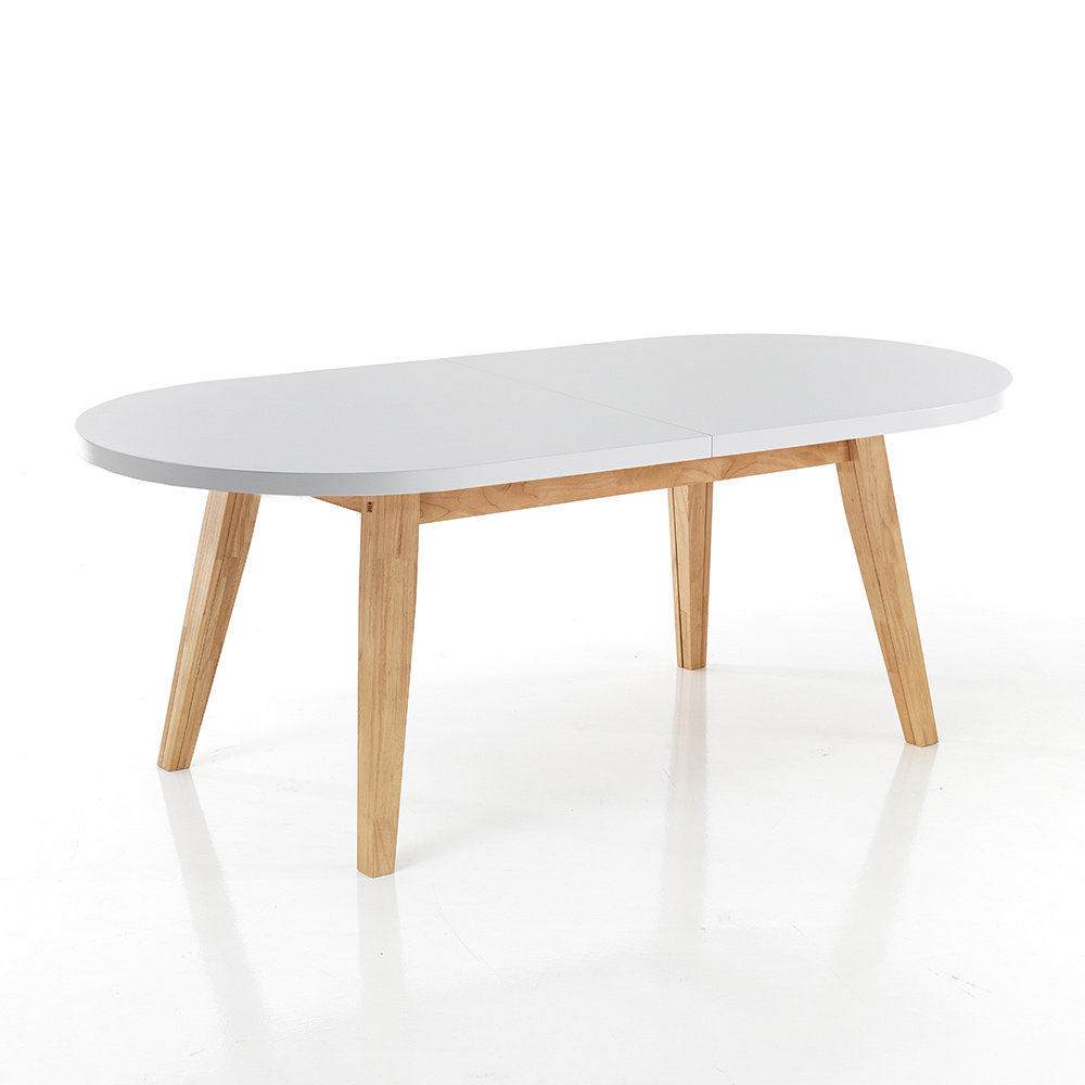 Mesa de jantar com tampo oval extensível em MDF e madeira maciça.