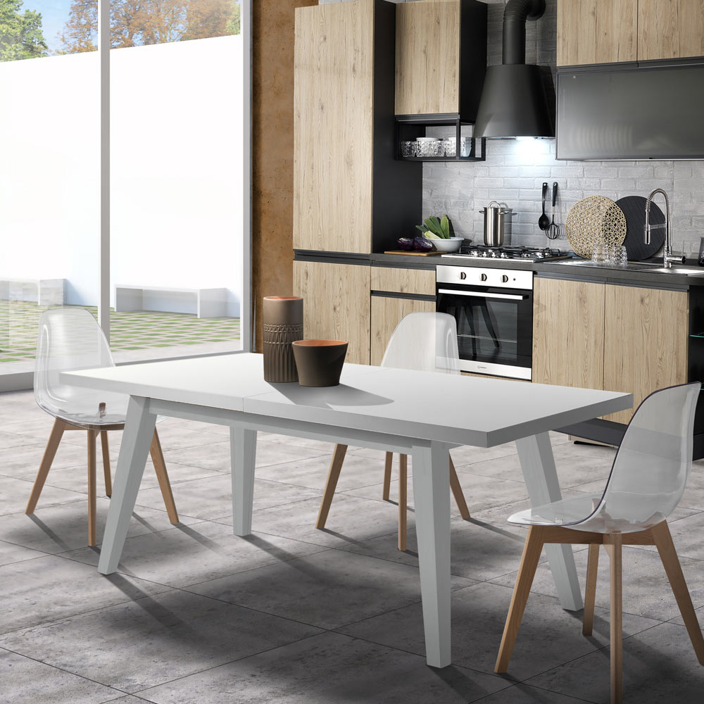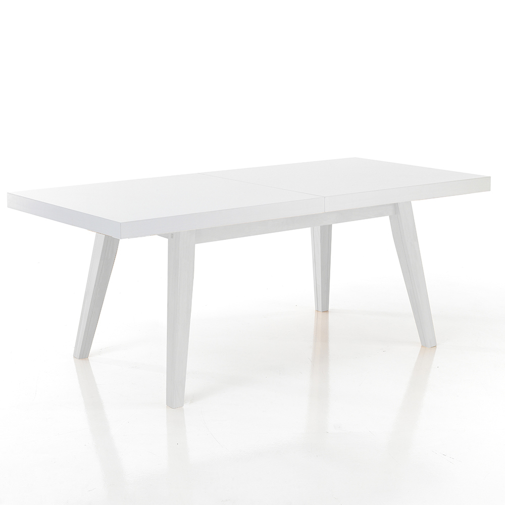 mdf lacado a branco semibrilhante com 4 extensões posicionadas por baixo. Graças à possibilidade de ser alargado, pode acolher um maior número de amigos e familiares para passar agradáveis noites em companhia.