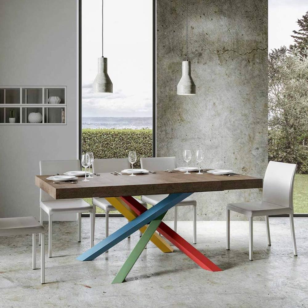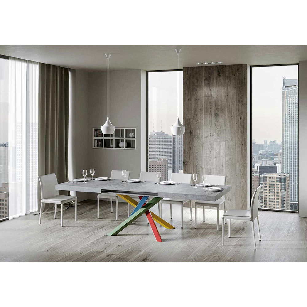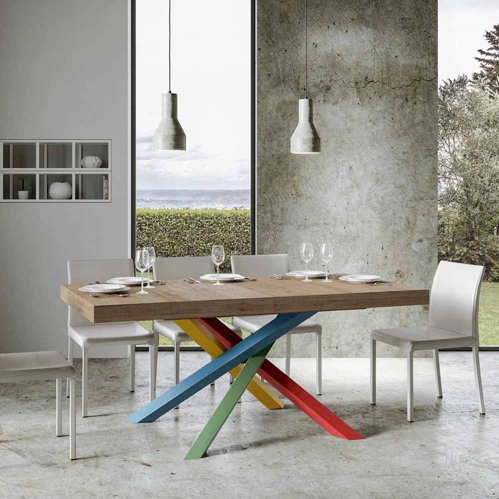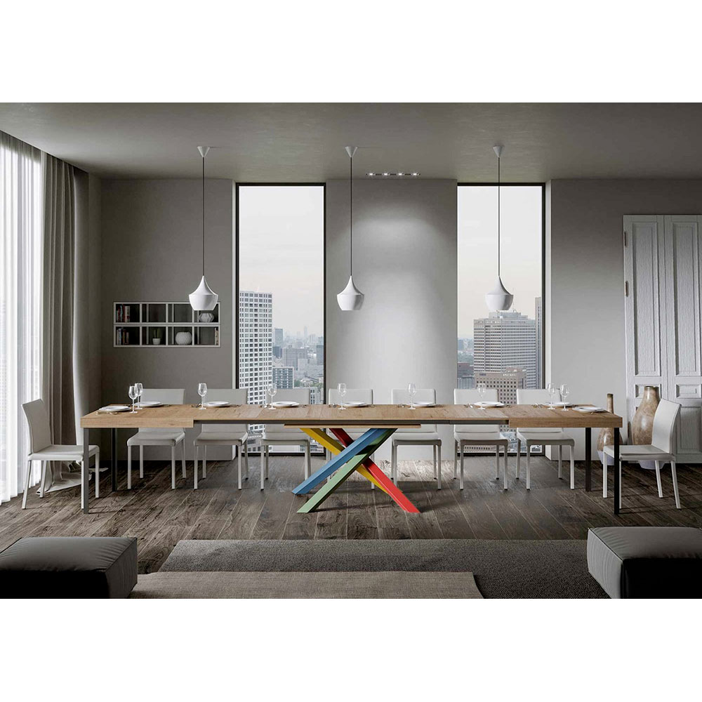 Descubra a mesa extensível, uma obra-prima do design moderno que se destaca por sua silhueta única e funcionalidade versátil. O tampo em madeira realça a luminosidade dos espaços, oferecendo uma superfície lisa e resistente que convida ao uso diário. A base da mesa é um verdadeiro espetáculo geométrico, com pernas cruzadas que se entrelaçam num jogo de cores. A combinação proposta é: Perna 1: Vermelho Carmim (RAL 3002). Perna 2: Verde amarelado (RAL 6018). Perna 3: Azul Distante (RAL 5023). Perna 4: Amarelo Sinal (RAL 1003).As cores RAL são opacas. Esta combinação não só acrescenta um toque de vitalidade ao design, mas também garante estabilidade&strong> e resistência. O mecanismo de extensão da mesa é tão simples quanto engenhoso, permitindo que esta elegante peça de mobiliário seja transformada de uma mesa prática para quatro pessoas em uma área aconchegante para receber jantares e reuniões maiores.