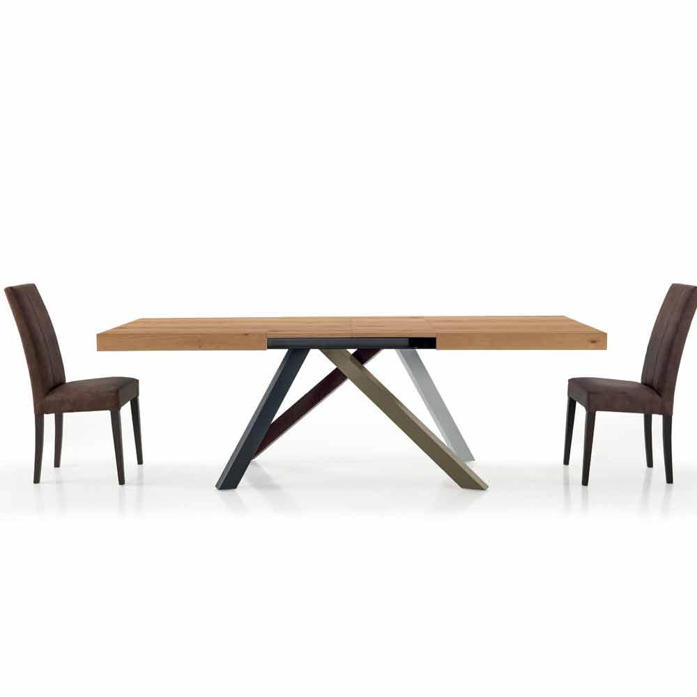 Mesa de jantar extensível até 450 cm com tampo em madeira laminada e base em aço fabricado na Itália.