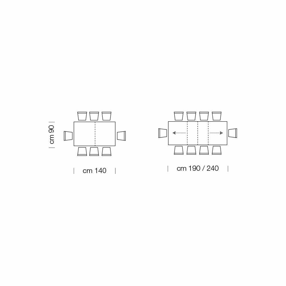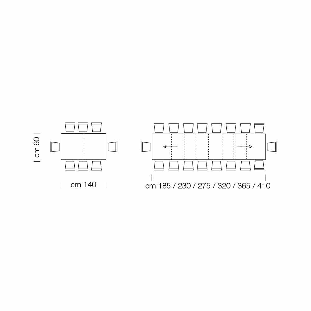- C 140 (410) x P 90 x A 75,3 cm 18 assentos extensíveis com três extensões internas de 45cm cada e três extensões externas de 45cm cada;