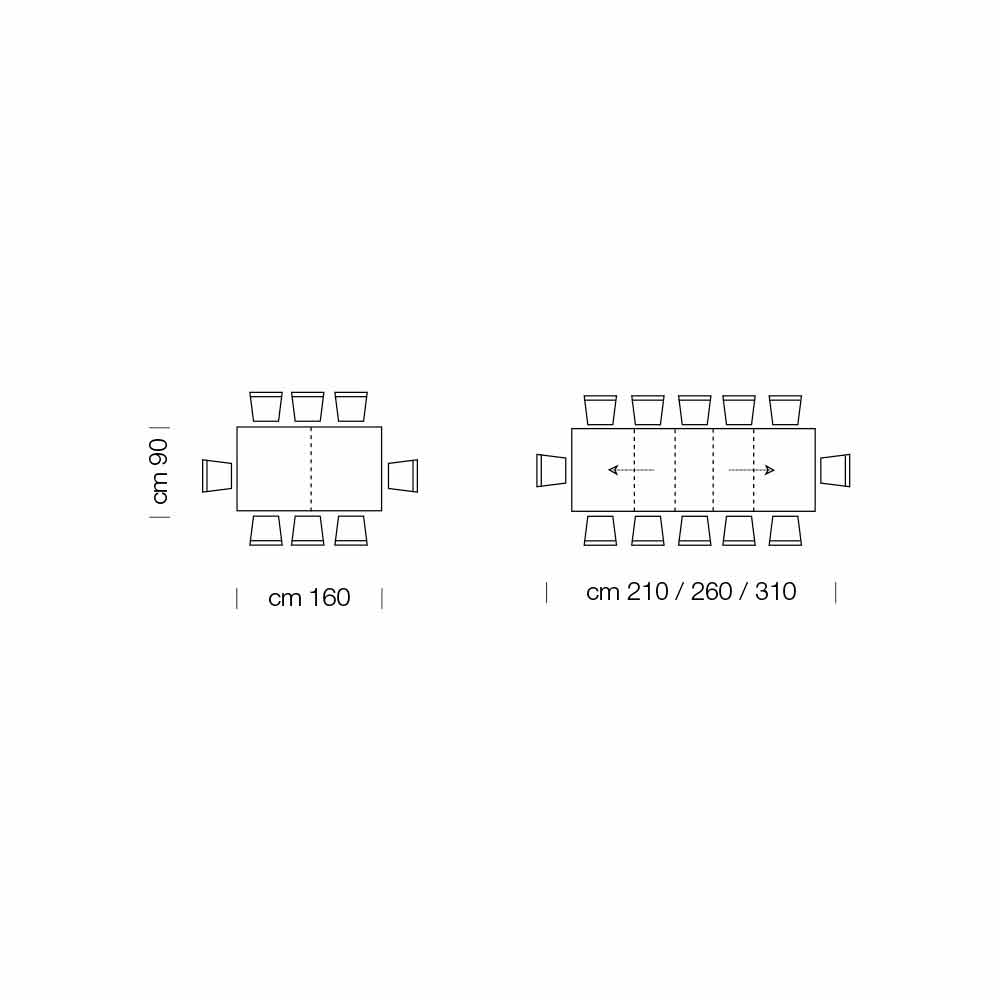 - C 160 (310) x P 90 x A 75,3 cm 12 lugares extensíveis com três extensões internas de 50cm cada;