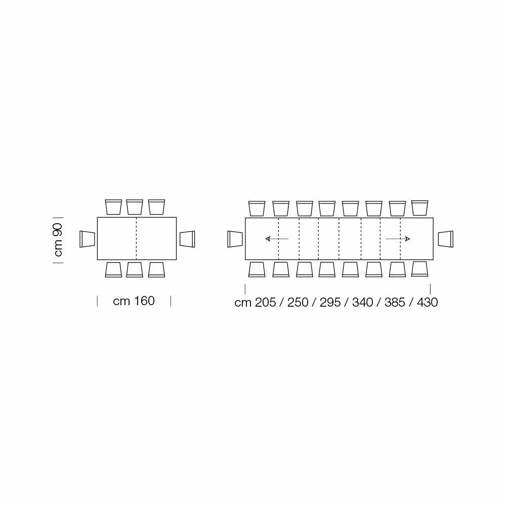 - C 160 (430) x P 90 x A 75,3 cm 18 assentos extensíveis com três extensões internas de 45cm cada e três extensões externas de 45cm cada;