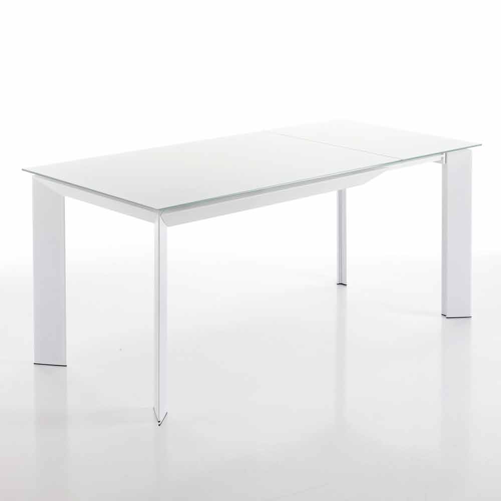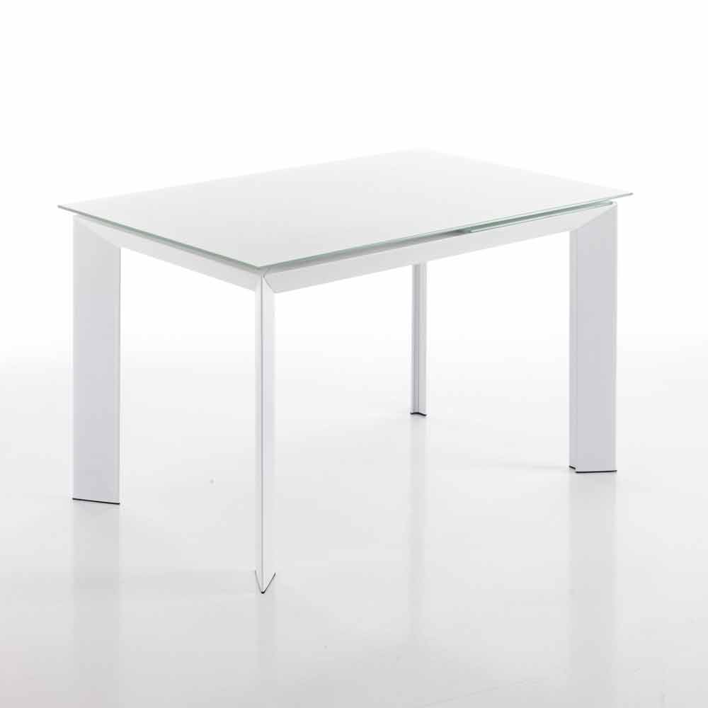 A mesa extensível de design moderno Zeno tem um tampo em vidro temperado pintado de branco, com 8 mm de espessura e uma estrutura metálica pintada de branco mate.
