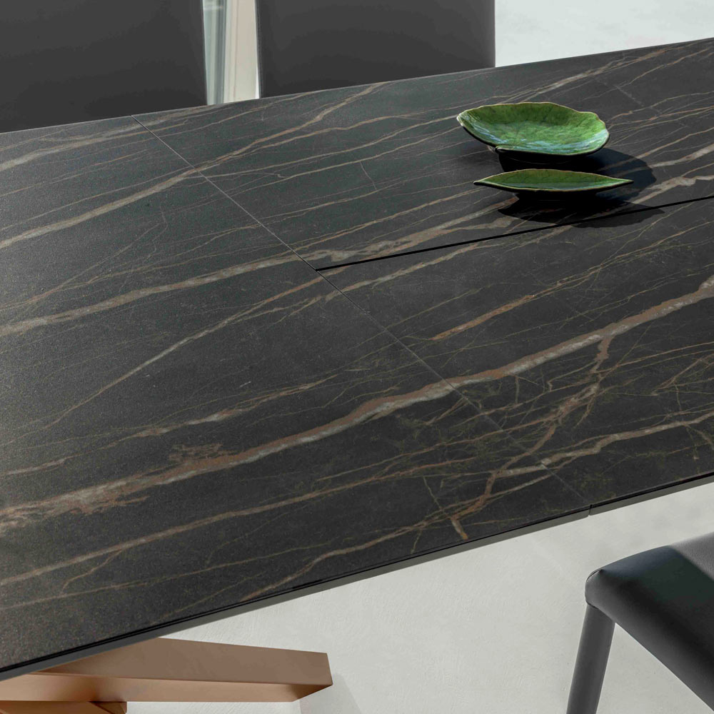 tampo de cerâmica matt noir desir, extensão de cerâmica matt noir desir com grão contínuo e base de metal com acabamento em cobre em relevo